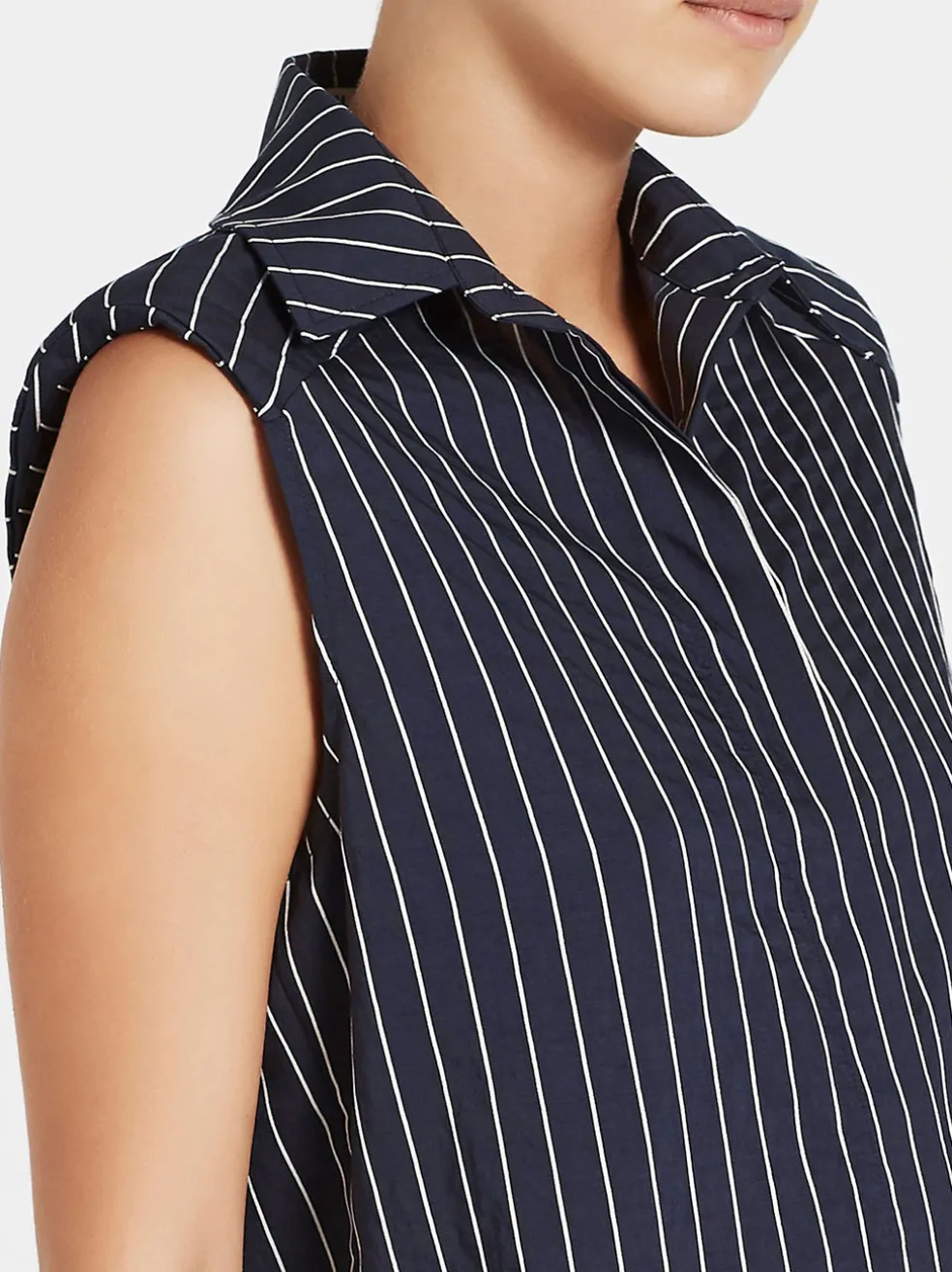 Inspire minimalist vacation style in the Pollino Stripe Sleeveless Shirt in Navy & White Stripe by C&M Camilla and Marc. Constructed from an ultra soft rayon blend, this sleeveless shirt features a classic collar with a centre front button down placket and back yoke finished with a curved hemline. Team with your favourite denim or wear over your swimsuit. To complete the day to night look pair with the Camilla and Marc Pollino Stripe Pant in Navy & White Stripe.