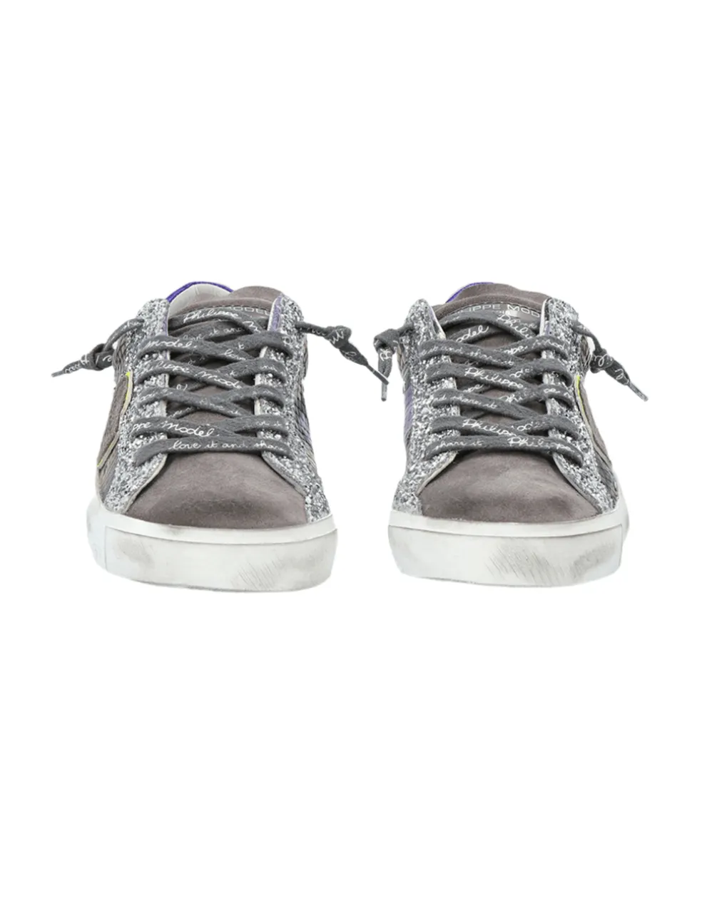 Find immediate street cred comfort with the Philippe Model PRSX Low Sneaker in Animalier Phy Violet. These low sided sneakers fuze exotic snakeskin effect leather with soft suede and their signature glitter detail. These fashion forward Italian sneaker oozes day to day charm with features such as a signature lived in look with a contrasting metallic purple leather heel tab, fluro yellow logo motif detail and sliver glitter eyestay, finished with tonal grey logo printed laces.