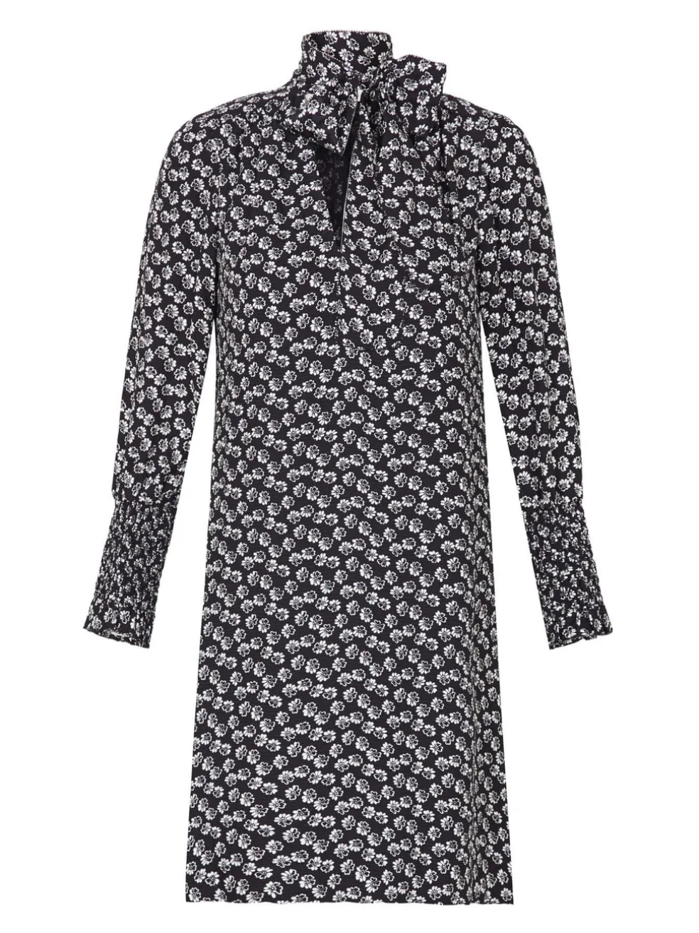 The Rebecca Taylor Rue Floral Print Scarf Tie Dress is the perfect piece to add to our trans-seasonal wardrobe. Constructed from a floral printed silk, this black and white shirtdress features long sleeves with a smocked, statement finish, a v neckline and is completed with a chic tie at the neck. Wear yours with boots and your favourite slides.