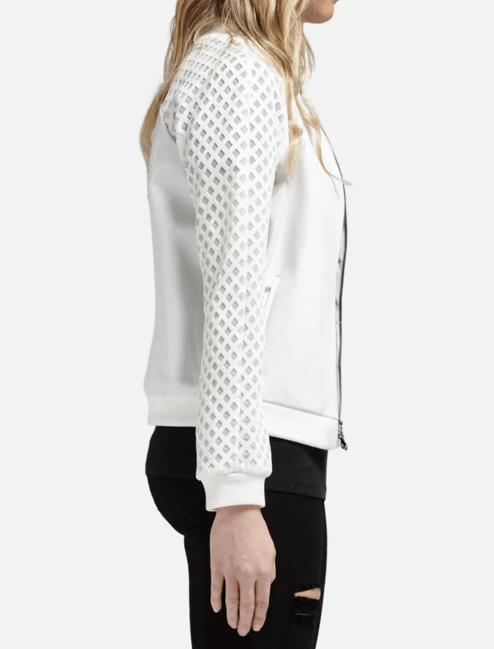 Get on top of the Sports Luxe trend with this leather bomber jacket from Rebecca Minkoff. With cool neoprene mesh sleeves in a crosshatched design, and ribbed detailing along the neckline, hem and cuffs, this piece is sure to give you an extra edgy look.