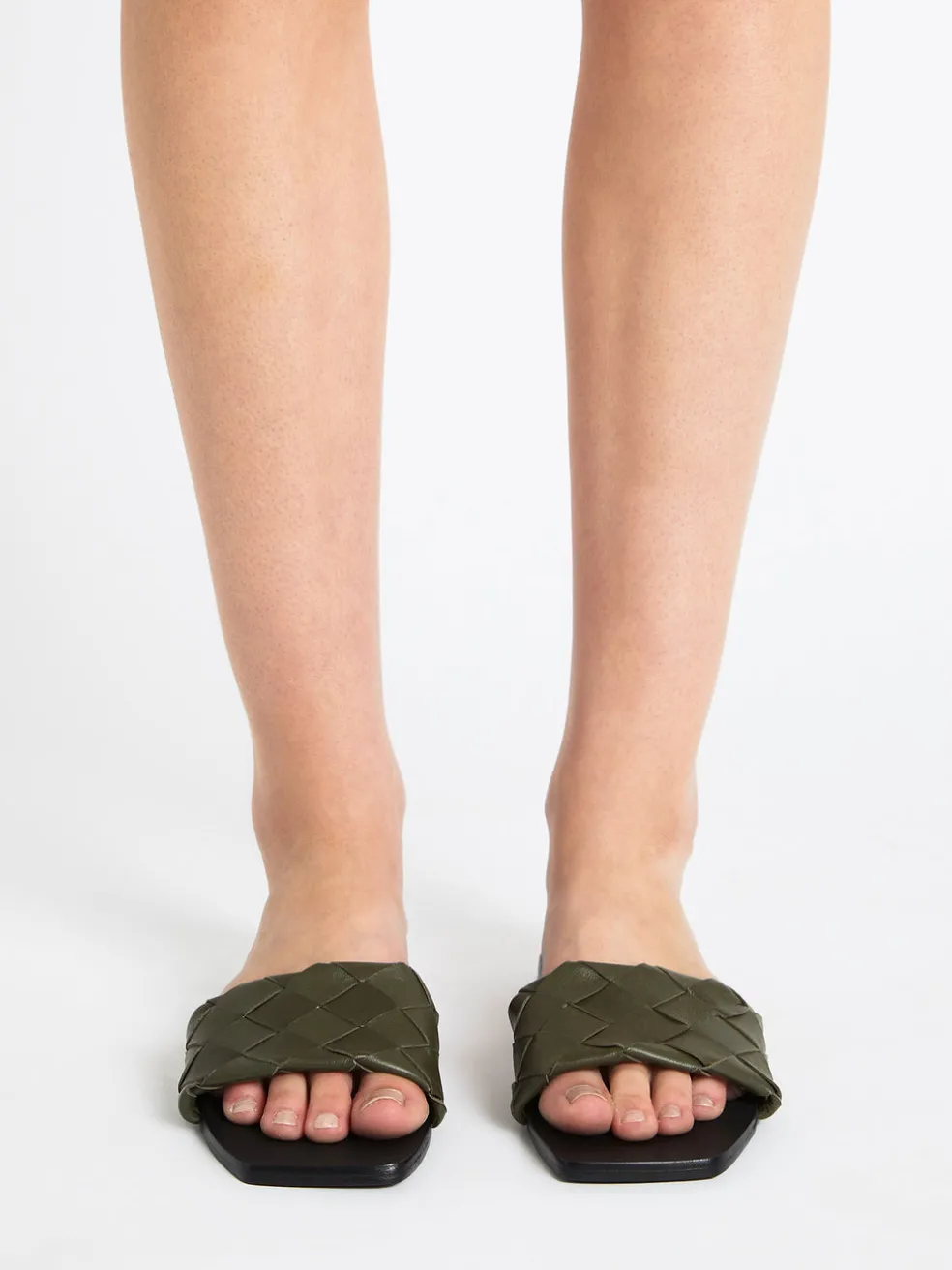 Keep it easy in the Sol Sana Sage Slide in Moss this summer. Constructed from leather, these relaxed styled slides feature an exaggerated basket weave detail and are finished with a strong square finished toe, making this elevated staple a summer must.