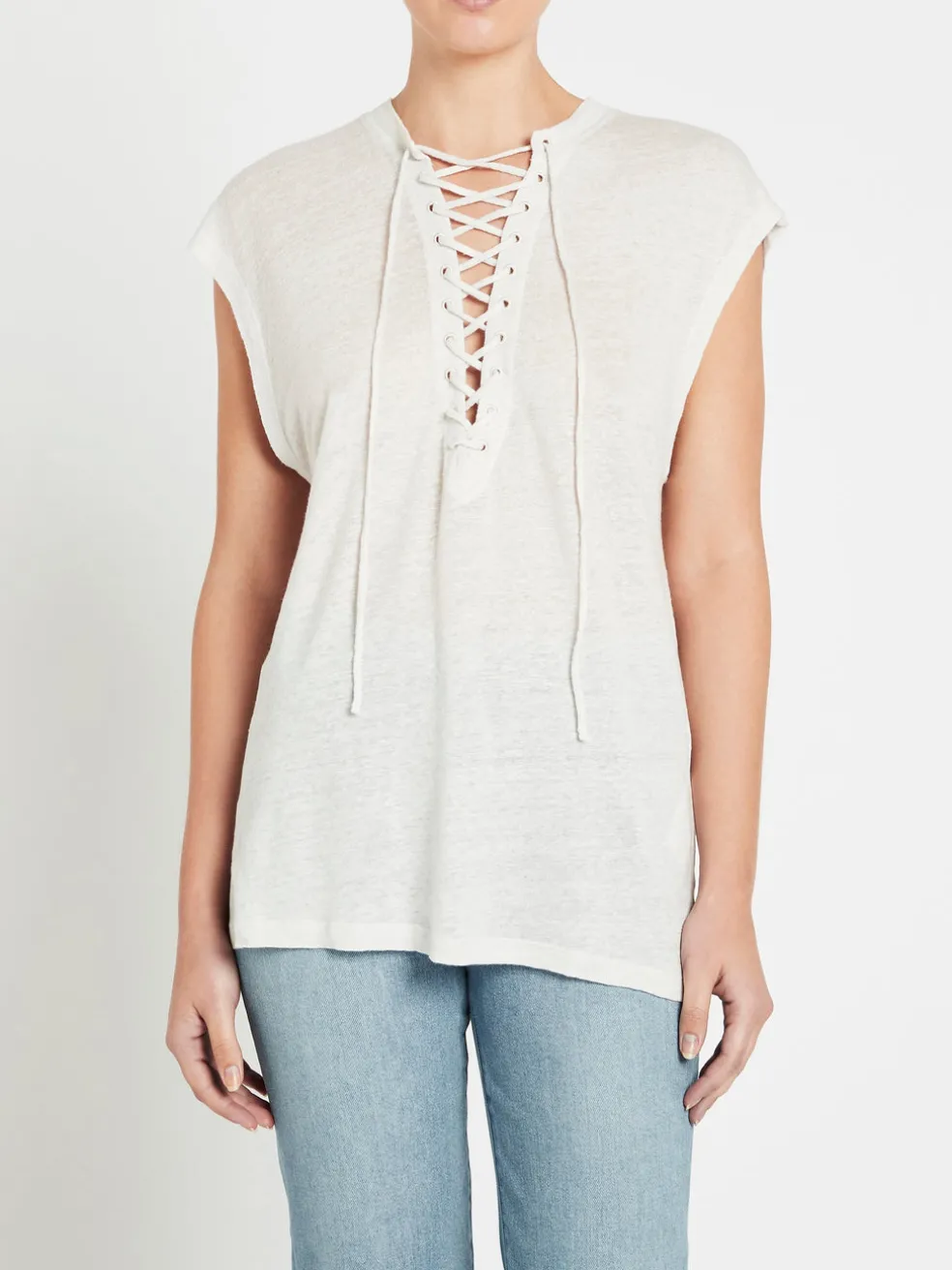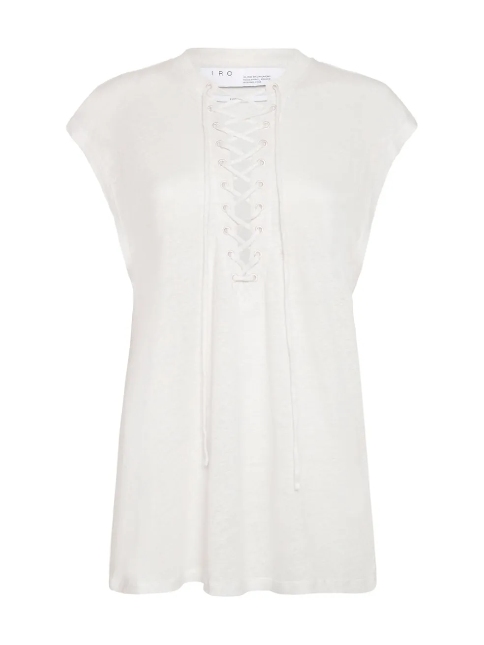 Say hello to the IRO Saturne Tank in Cloudy White, your new basics favourite. Constructed from linen, this tank takes your basics to a new level with a deep v-neckline featuring a lace tie cross front. Pair back with your high waisted denim or shorts for an effortless off-duty look.