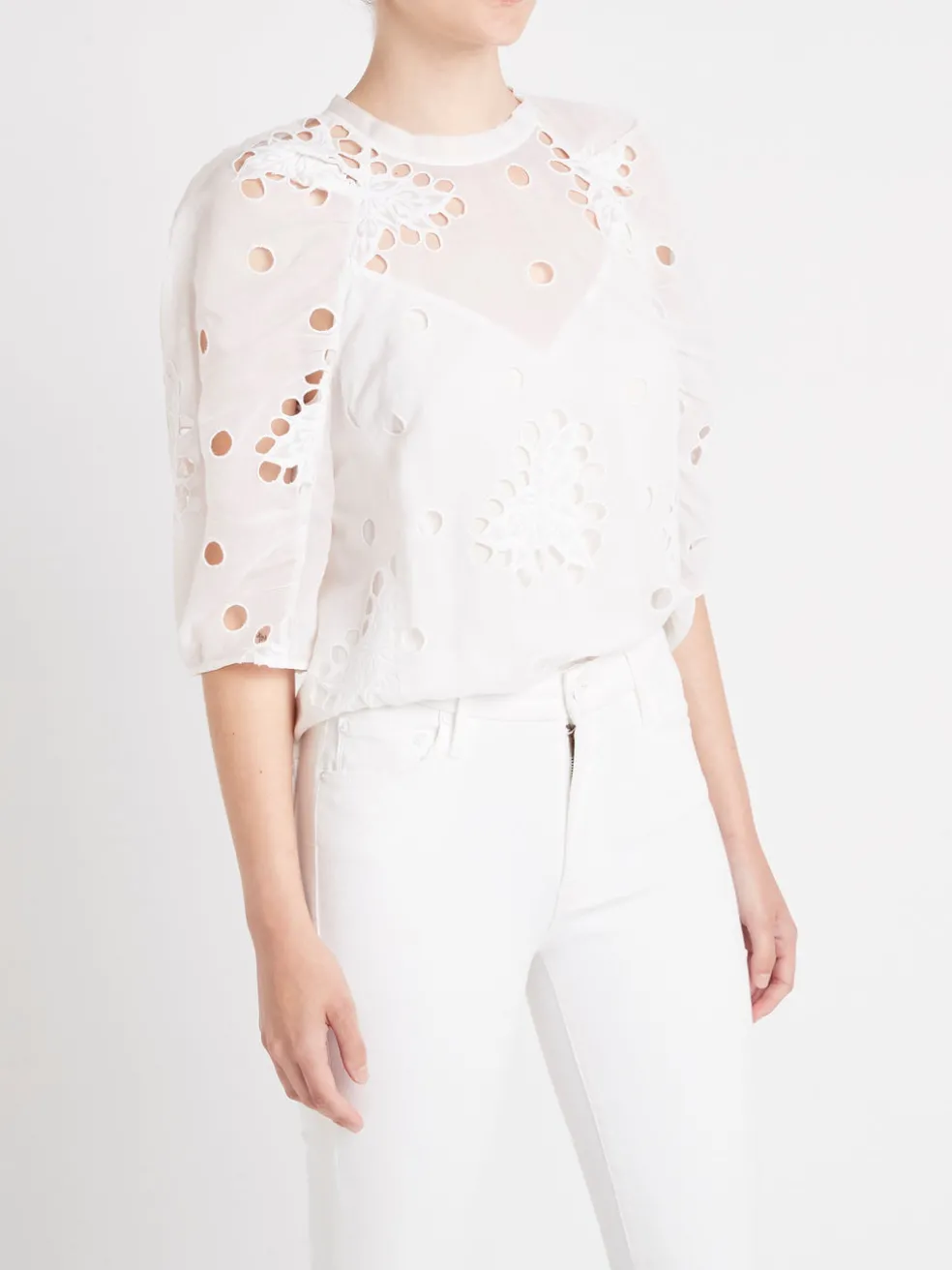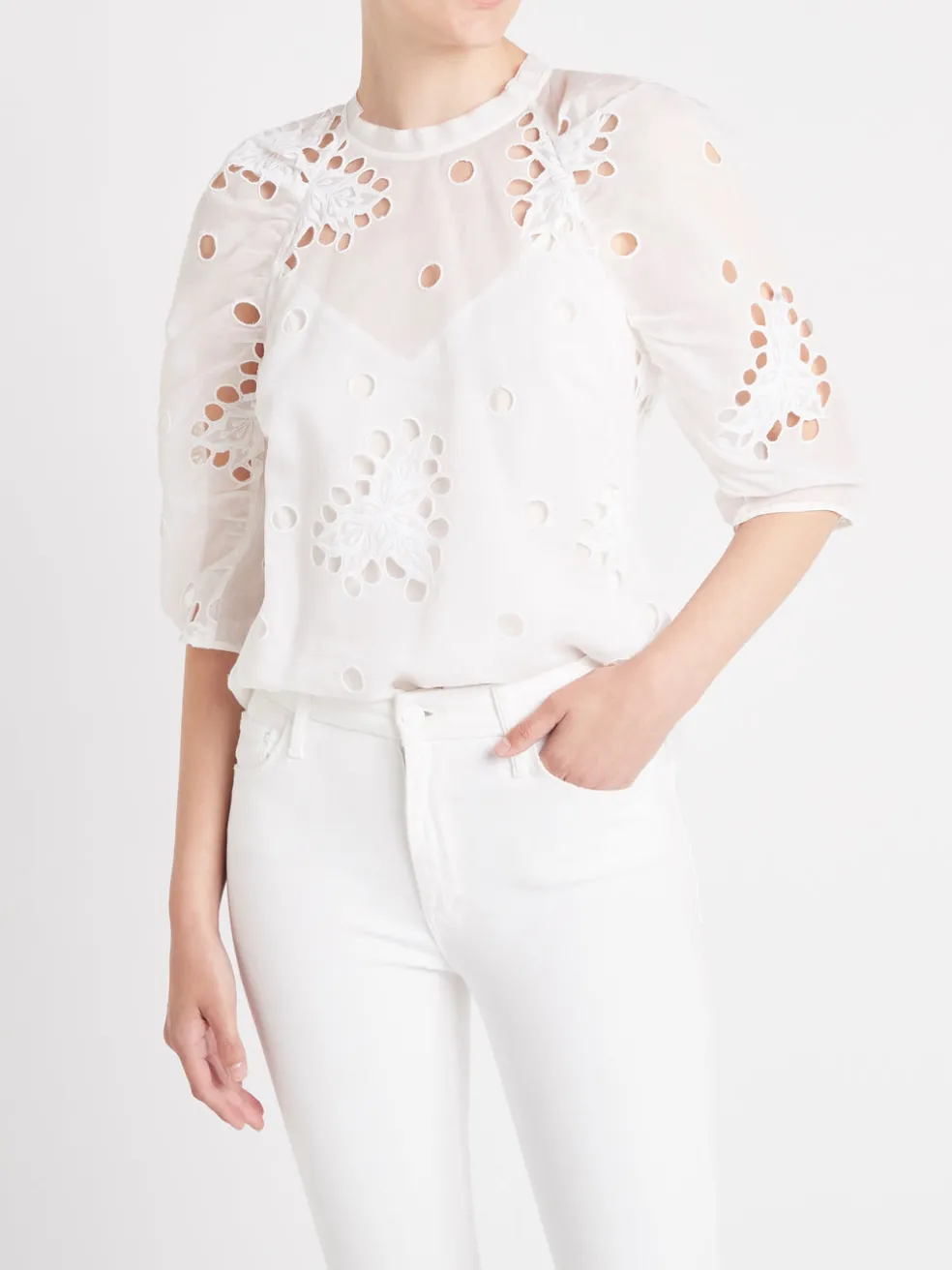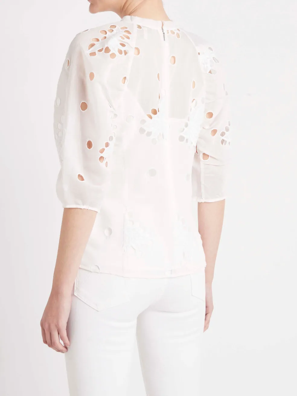Add a touch of whimsical romance to your wardrobe with the Rebecca Taylor Short Sleeve Honeysuckle Top in Milk. Constructed from a cotton, silk blend this piece features elbow length puff raglan sleeves, a centre back zip opening, eyelets edged with tonal embroidery and is finished with a cami style lining. Team with a black leather mini skirt and killer heels for perfect date night style.
