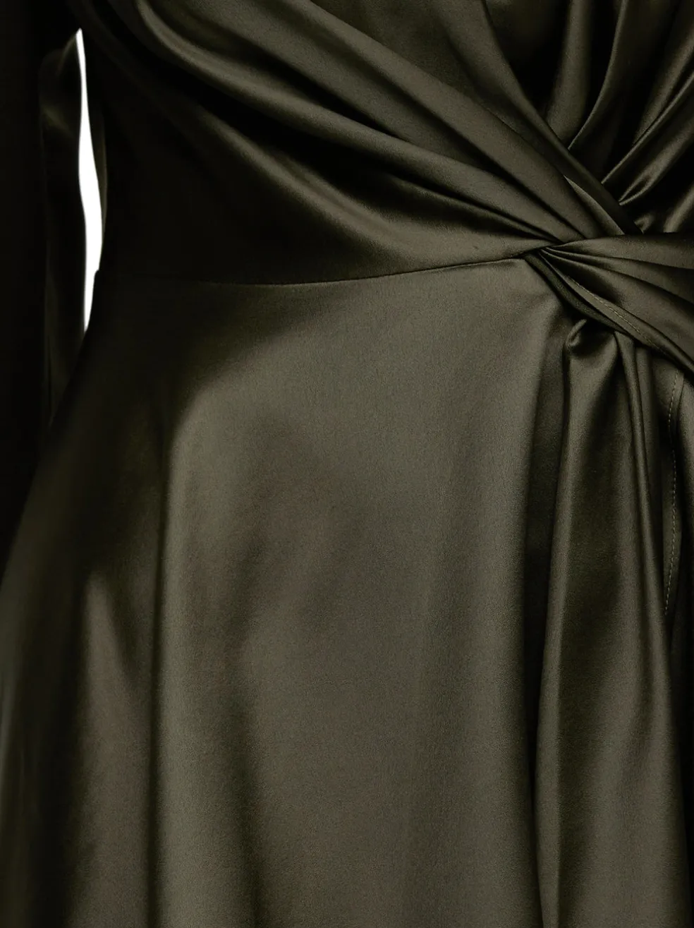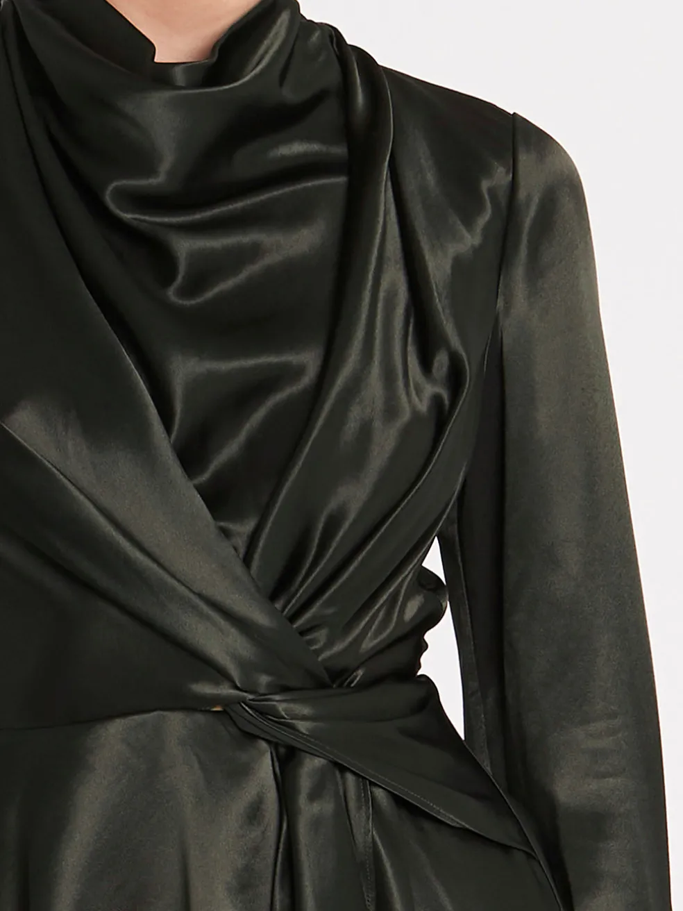 The Acler Simmons Dress in Forest Green is a shining delight inspired by nature. The fitted bodice has a mock cowl neck which flows down the body and gives way to a relaxed floaty skirt, featuring full length tailored sleeves with gold button detail. The silky fabric is artfully draped across the bodice and finished in a twist detail at the side of the waist.