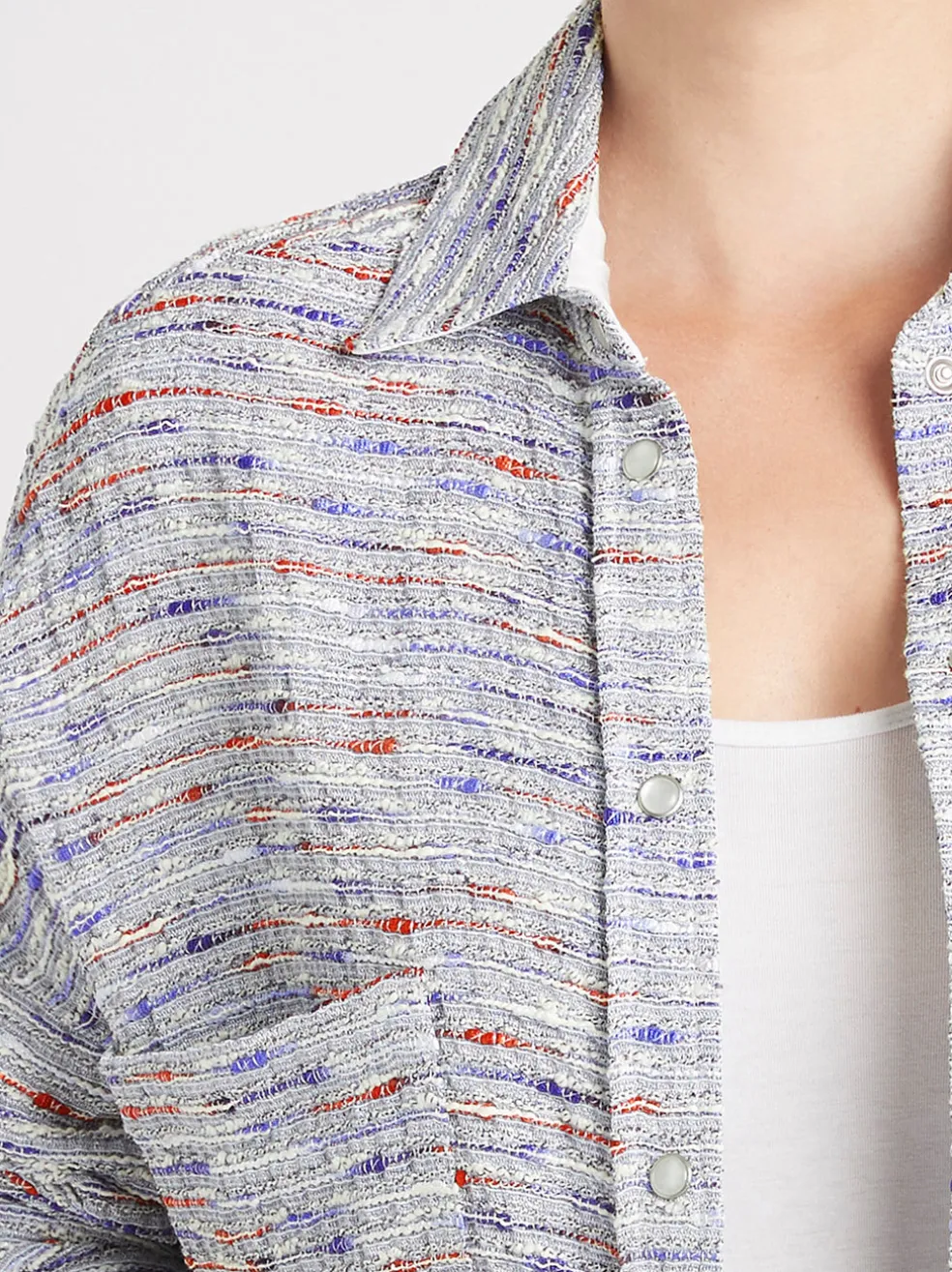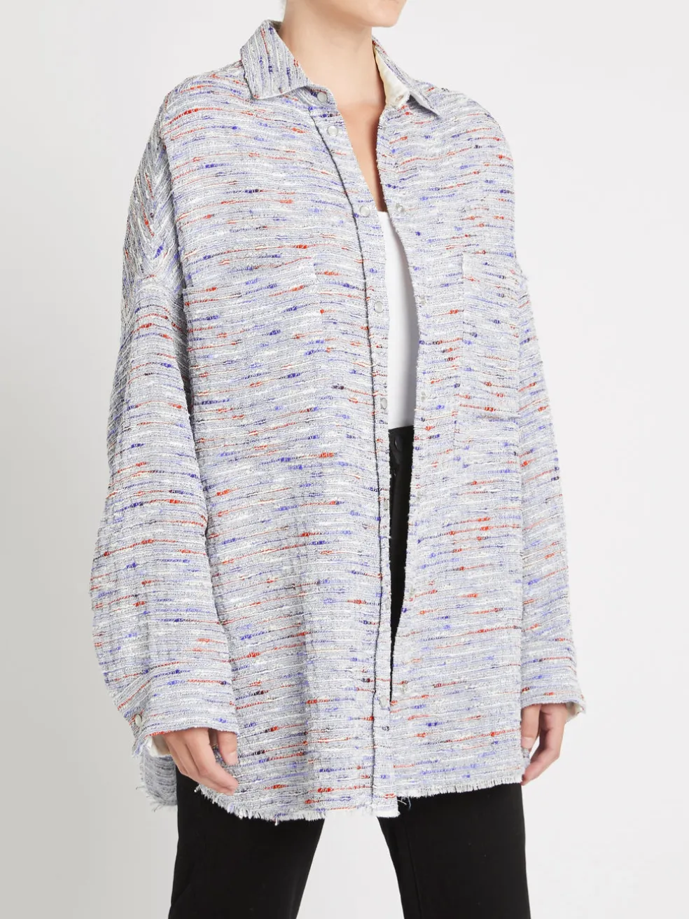 Add a touch of metallic sparkle to your wardrobe with the IRO Soal Overshirt in Multico. Constructed from a cotton blend with a textured, multi coloured weave this oversized shirt features a classic collar, snap button closure down the centre front, long sleeves, and is finished with a raw hemline. The metallic flecks through this piece add a touch of luxe to elevate any outfit. Team with the IRO Durane Shorts for the complete look.