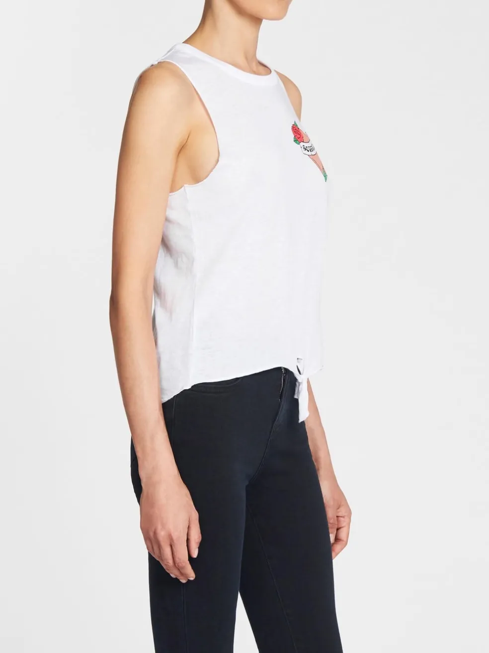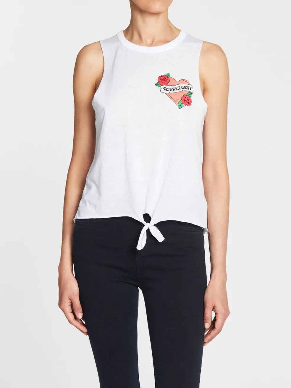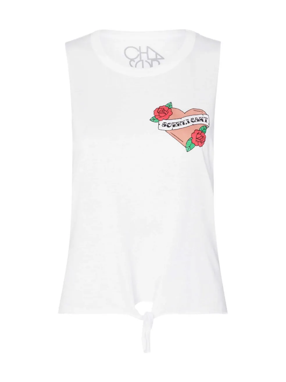The Chaser Sorry I Can’t Tank in White is the perfect addition to your off duty wardrobe. Constructed from a white cotton blend fabric this tank features a round neckline, raw cut armholes, an ultra cute print reading “sorry I can’t” and is finished with a front tie detail at the hemline.