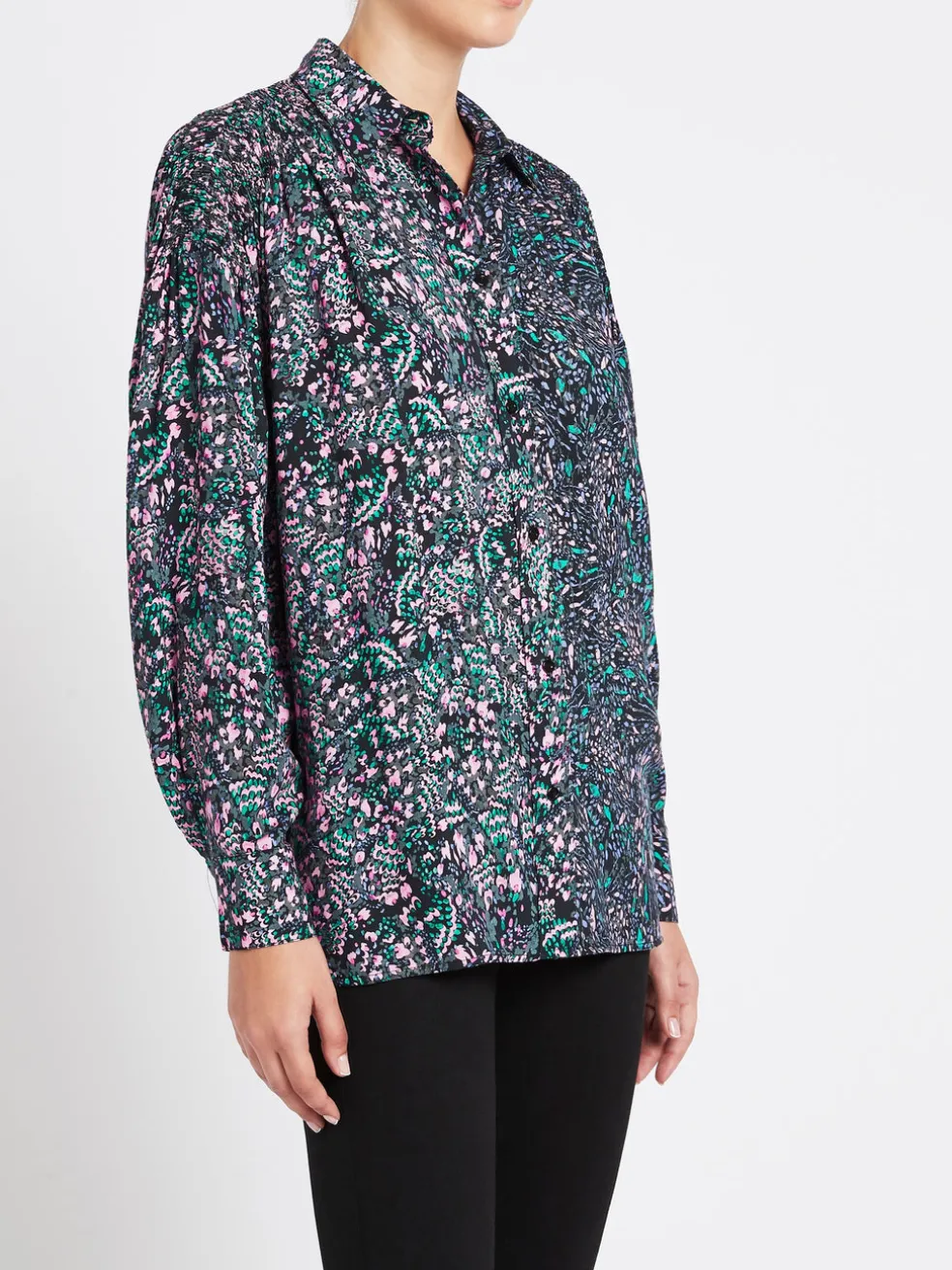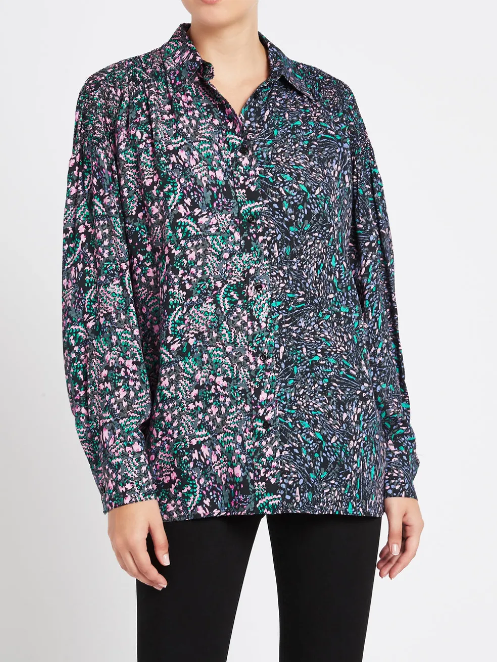 Give your denim new life with the effortlessly cool Stella Shirt in Mixed Black by IRO. Crafted in ultra soft rayon, this long sleeved shirt features a classic collar and button down placket with ruched detailing along the shoulder and is finished with a relaxed fit. Team with dark denim and boots for the ultimate weekend ready look.