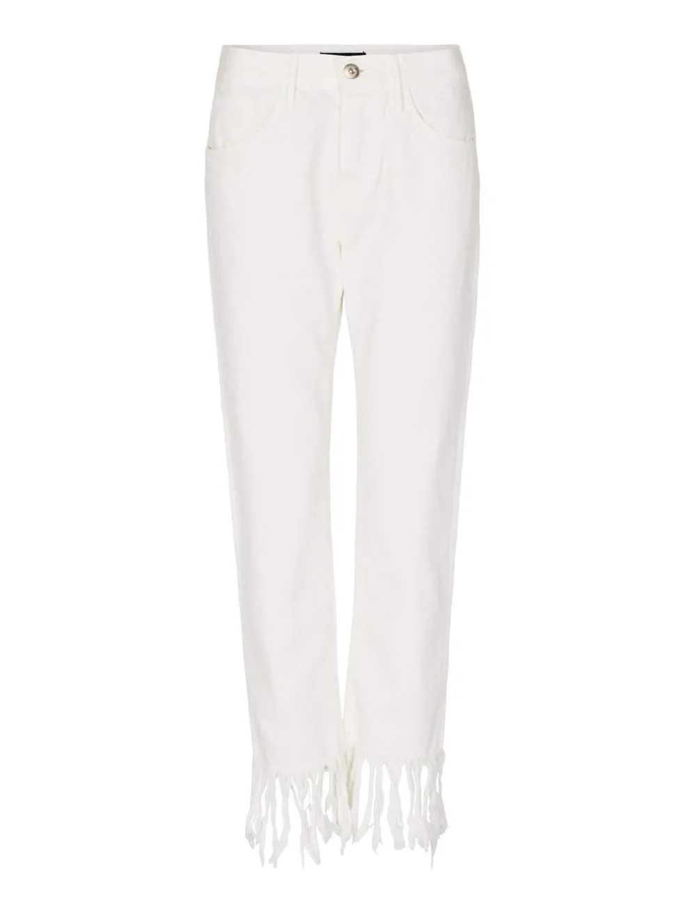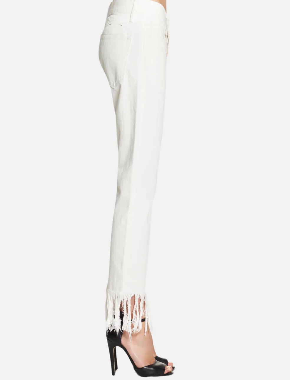 The 3×1 WM3 Crop Fringe Jeans in Bianca are a timeless straight leg fit with a button fly. Featuring a 4 inch fringe at the ankle and constructed in a clean white denim, these jeans are a modern must-have.