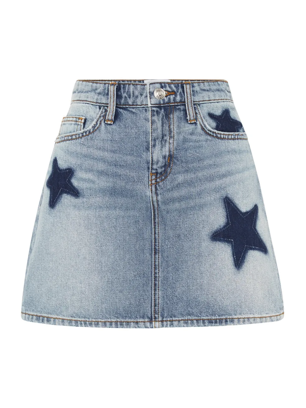 The classic denim skirt gets a Current Elliott upgrade with the 5 Pocket Mini Skirt in Fiola with stars. Cut with a high waist in the perfect light wash this skirt features a zip fly single button closure, front and back pockets, whiskering down the thighs and is finished with mid denim wash star print for a cool girl twist. Team back with a vintage tee and sneakers for the ultimate weekend laidback look.