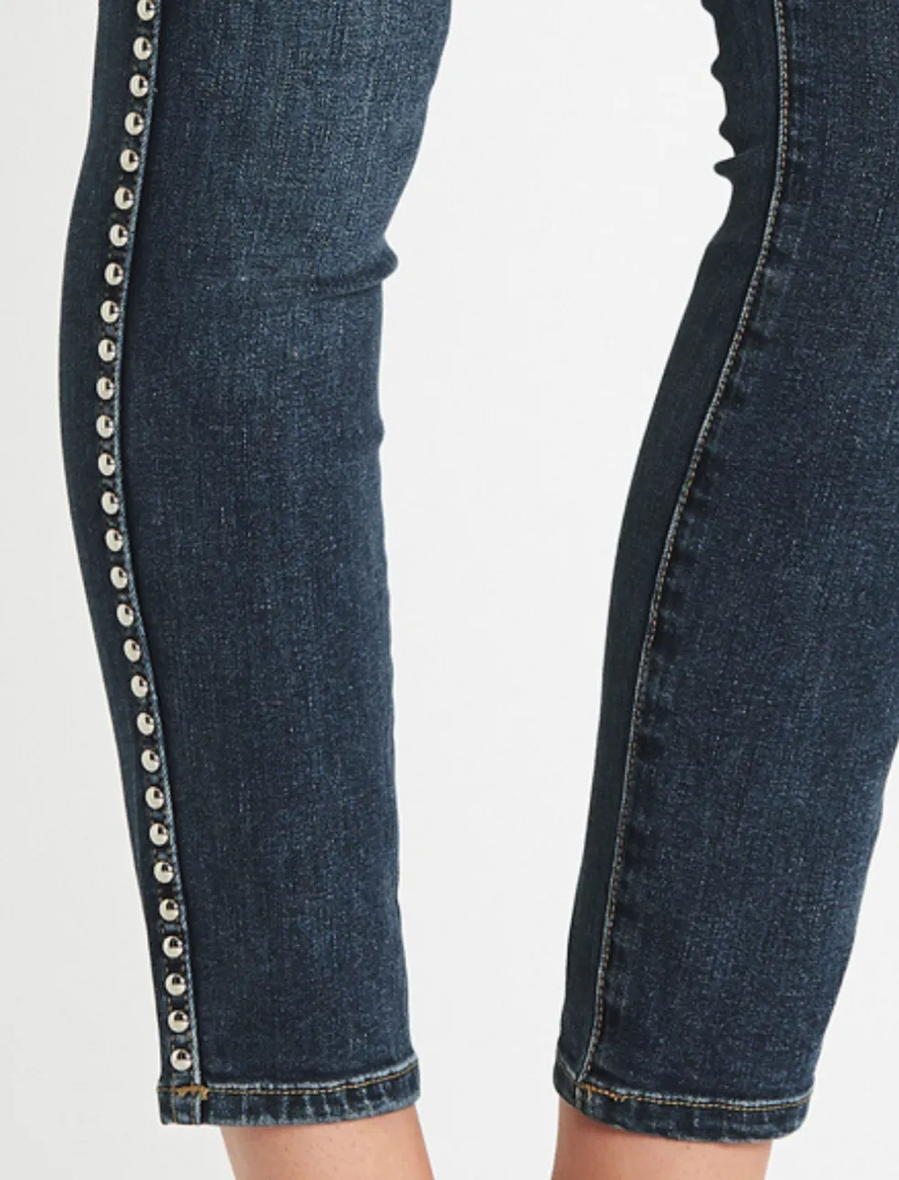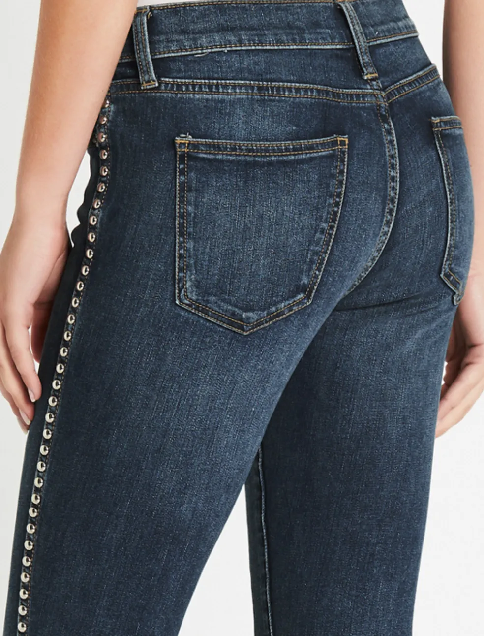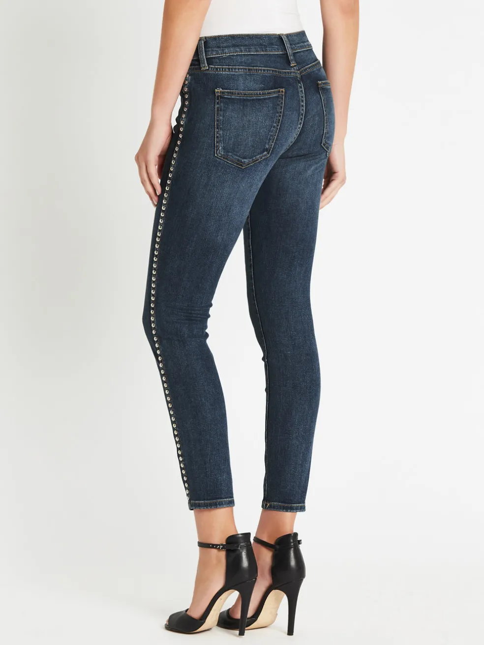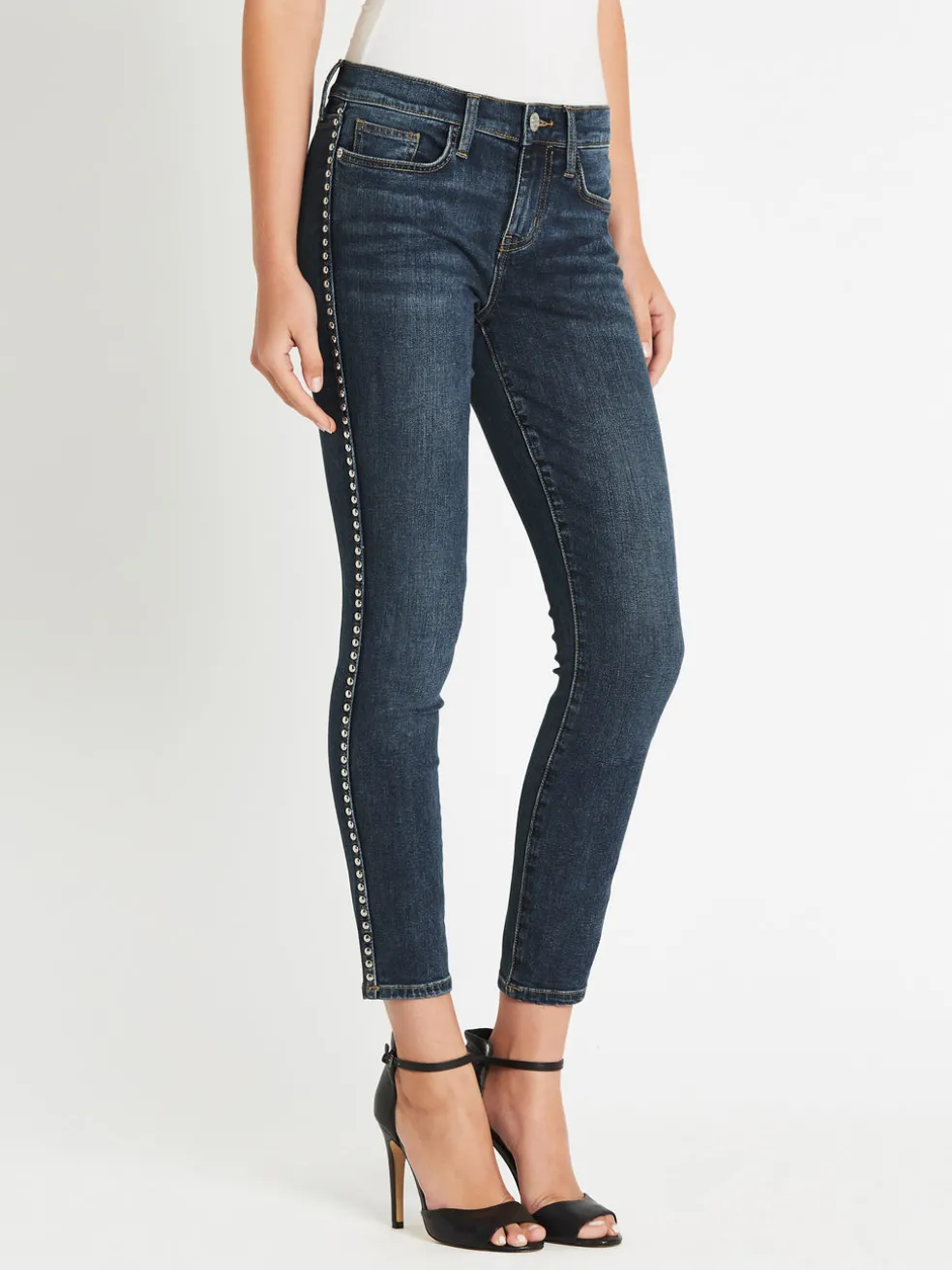 Constructed in a stretch cotton blend with a dark denim wash, the Caballo Stiletto Jean by Current Elliott comes here in the colour Kelby and features a mid rise, front and back pockets and is finished with silver studded trimming to add some viva rock chic to your day