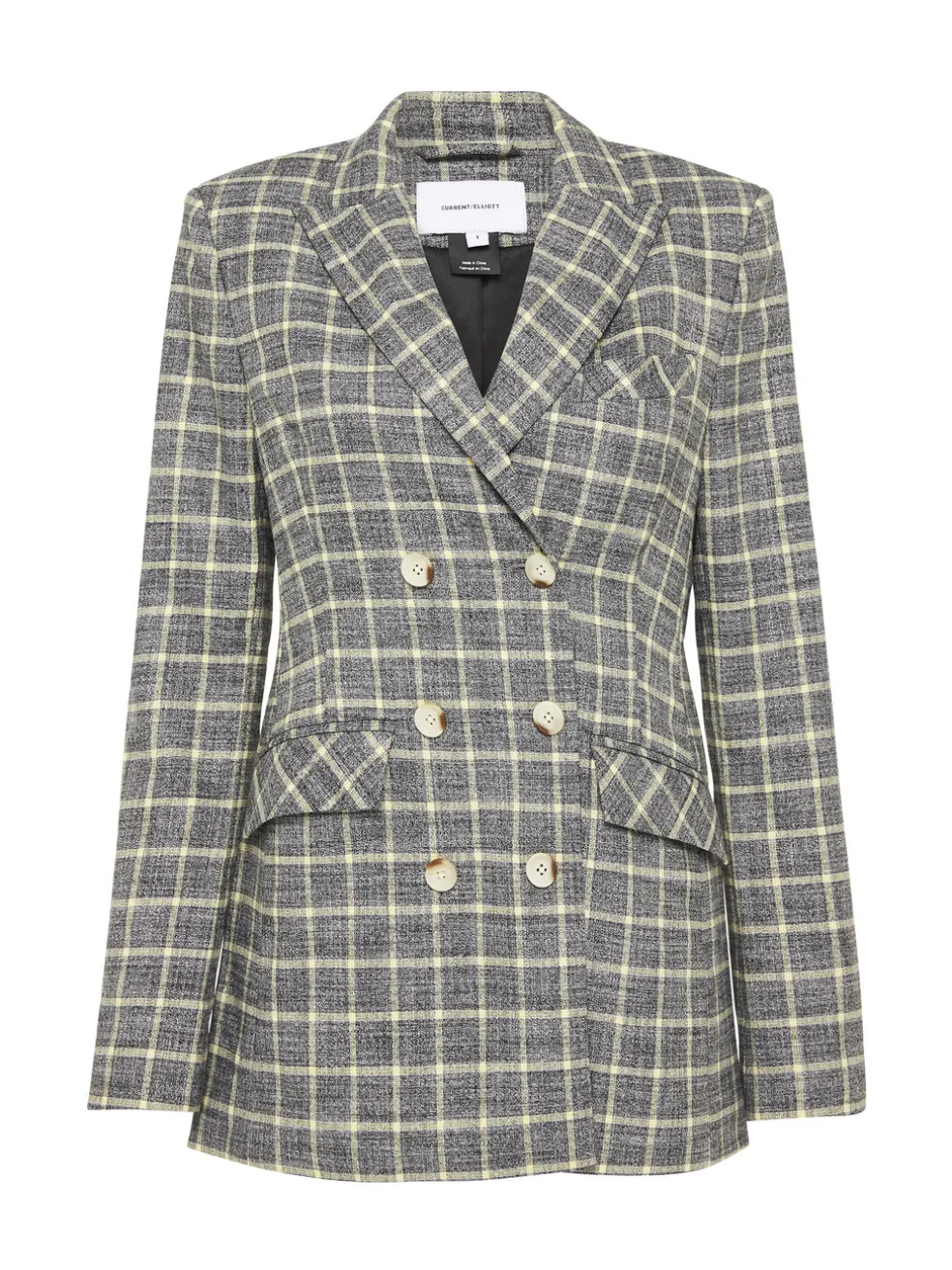 Check Please! Get on the check bandwagon with the Current Elliott Demi Blazer in Black Sulphur. Constructed from a polyester blend this longline blazer features classic lapels, soft shoulder pads, twin set centre front button opening and is finished with side flap pockets. This piece is inspired by vintage 70s menswear and is designed to have an oversized fit.