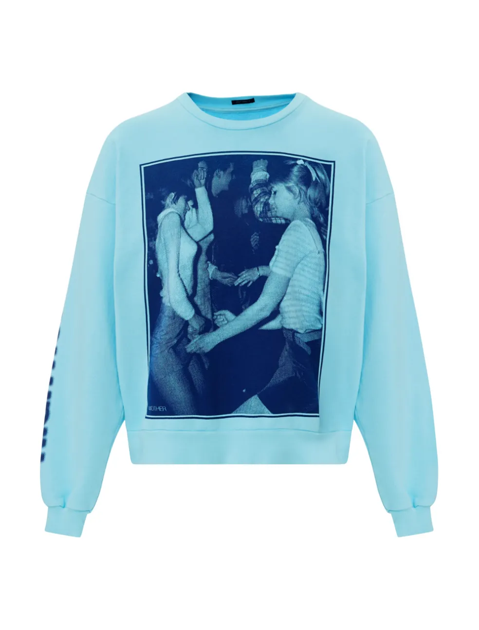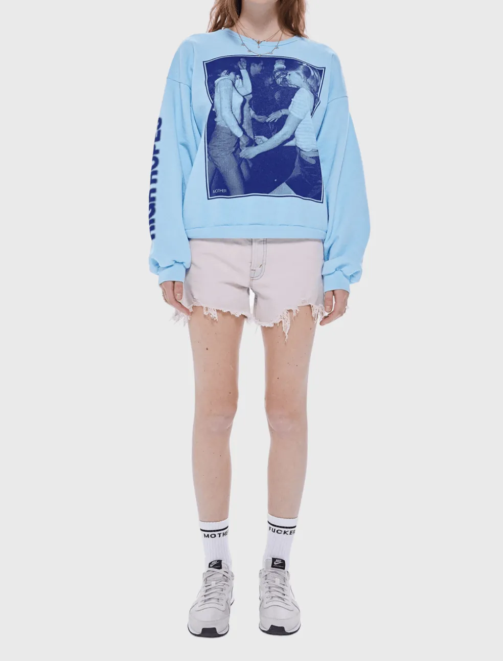 Take it easy in the Mother Denim Drop Square Sweatshirt in High Hopes. This oversizes round neck sweater is constructed from 100% cotton and features drop shoulders, long sleeves with a cuff finish and is completed with a super cool 70s dance print on the front in a dark blue shade and a blurred half tone font down the sleeve that reads “high hopes”.