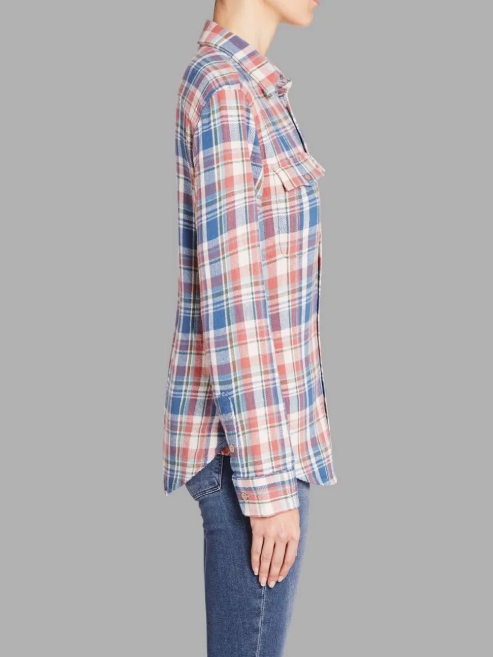 Get ready for any season with the soft washed flannel shirt from MOTHER. This versatile women’s designer fashion piece is a must-have in your wardrobe. The light salmon color paired with sky blue creates a beautiful muted plaid, making it easy to match with any outfit. With its flap front pockets, fold-over collar, and button placket, this shirt combines style and functionality. Whether you’re looking for a cozy weekend look or a chic office outfit, this soft washed flannel shirt is the perfect choice. Don’t miss out on this transeasonal essential. Buy now and elevate your wardrobe with the stylish and comfortable flannel shirt from MOTHER.