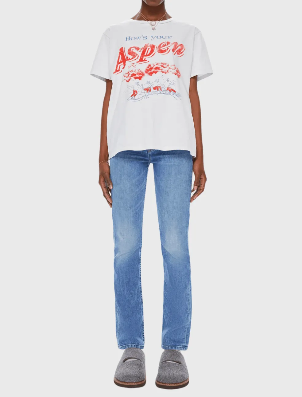 The Mother Denim The Rowdy Tee in How’s Your Aspen is perfect for those ski bunnies that prefer the apres life. Made from 100% cotton, this crewneck tee has an oversized fit for a vintage look and feel. The off-white tee features a faded red and blue ski graphic on the front, and a trail map of Aspen on the back. So Show Us Yer Slope Cred!