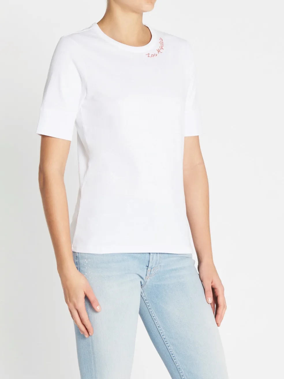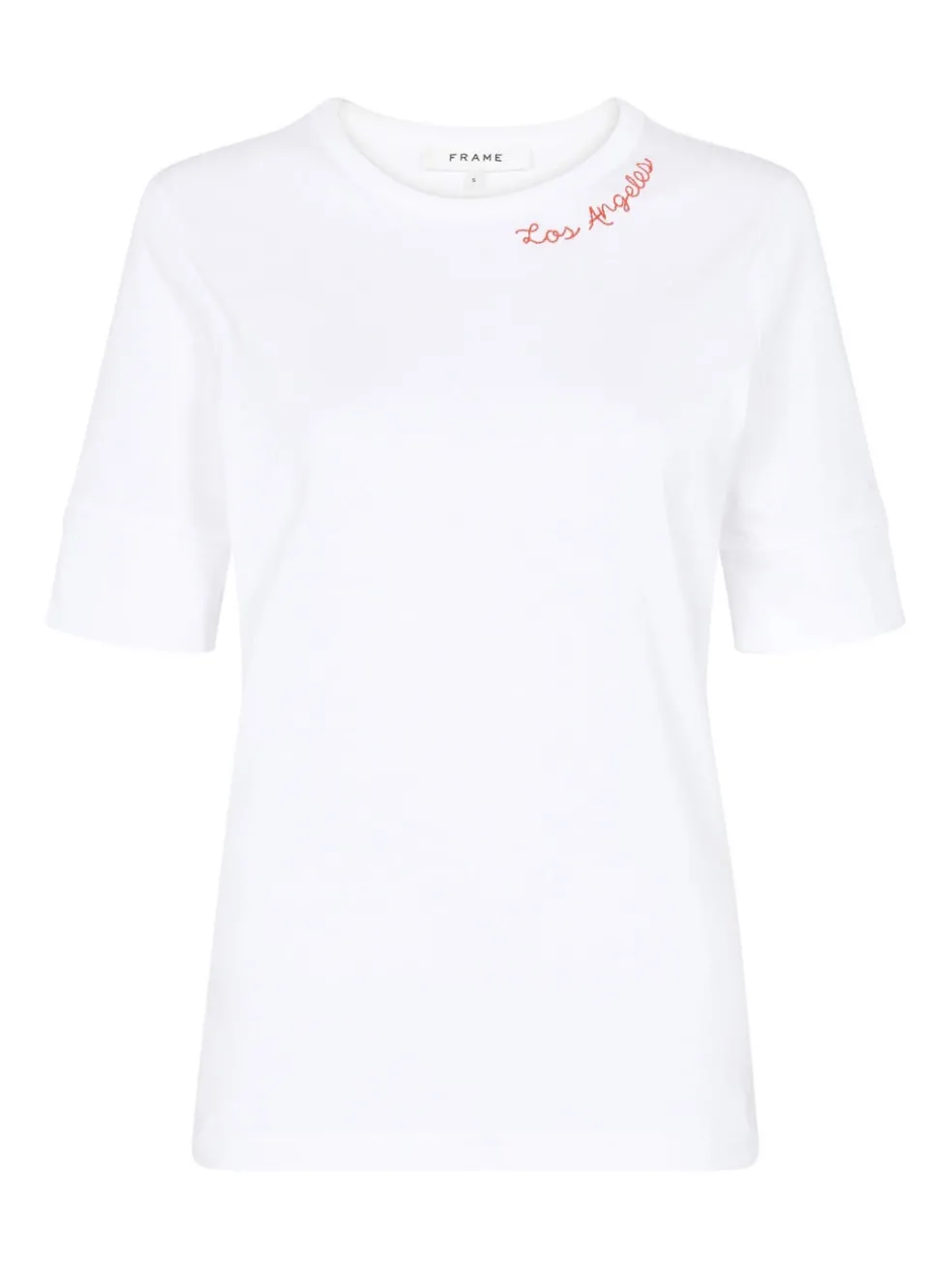 A white knit top from Frame Denim, the True Crew Tee features an embroidered orange “Los Angeles” graphic along its crew neckline. A slim fit, this style has banded cuffs and short sleeves.