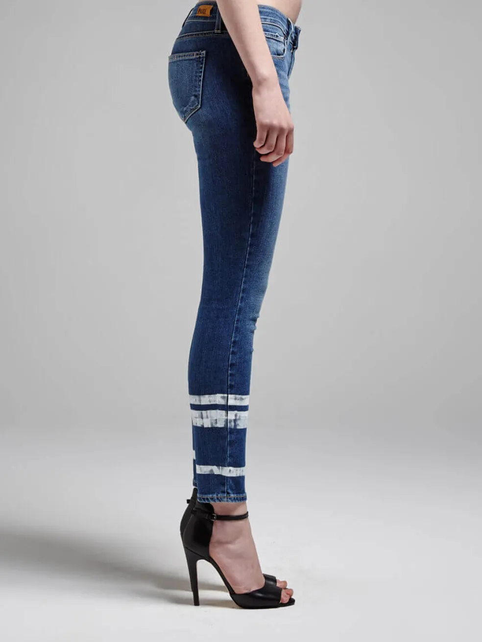 Cropped at the ankle and accented by a trio of hand painted white stripes along the calf, the skinny legged Verdugo Painted Stripe Jean from Paige are perfect for Summer, and for weekend trips away. These mid blue jeans have a low rise of 7.5 inches and are customised with tarnished brass hardware.