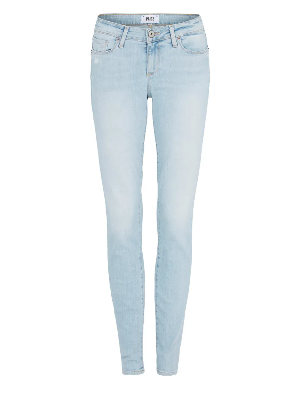 The super stretchy Verdugo Harriet Destructed Jean from American brand Paige are a light blue wash, and have a low rise of 7.5 inches. Accented by light silver hardware, these ankle length jeans have a skinny leg and slight destruction along the waistband and outer seam.