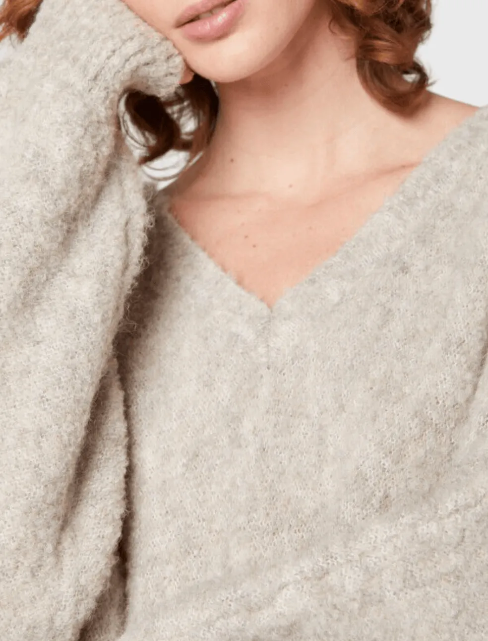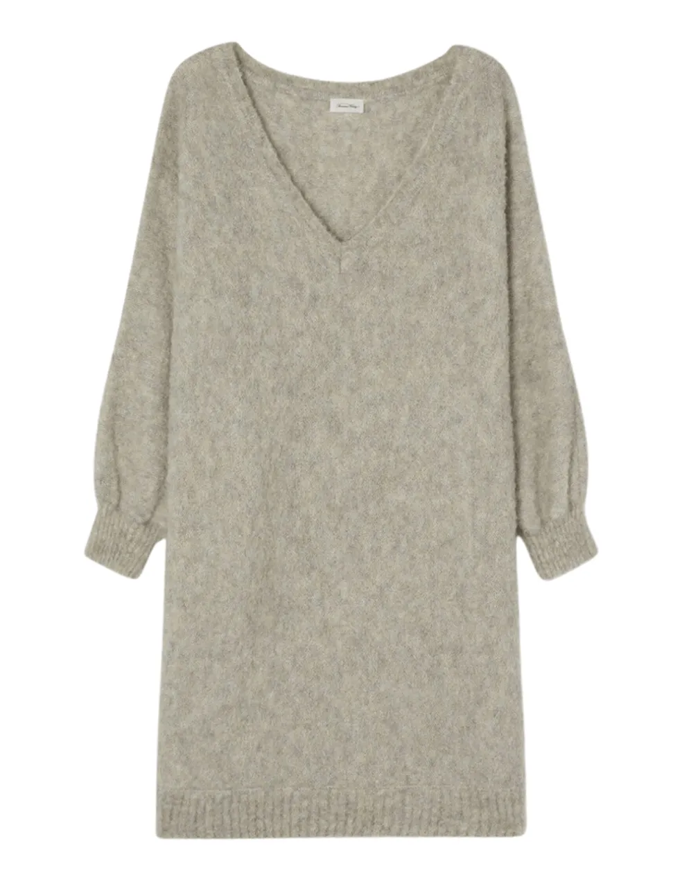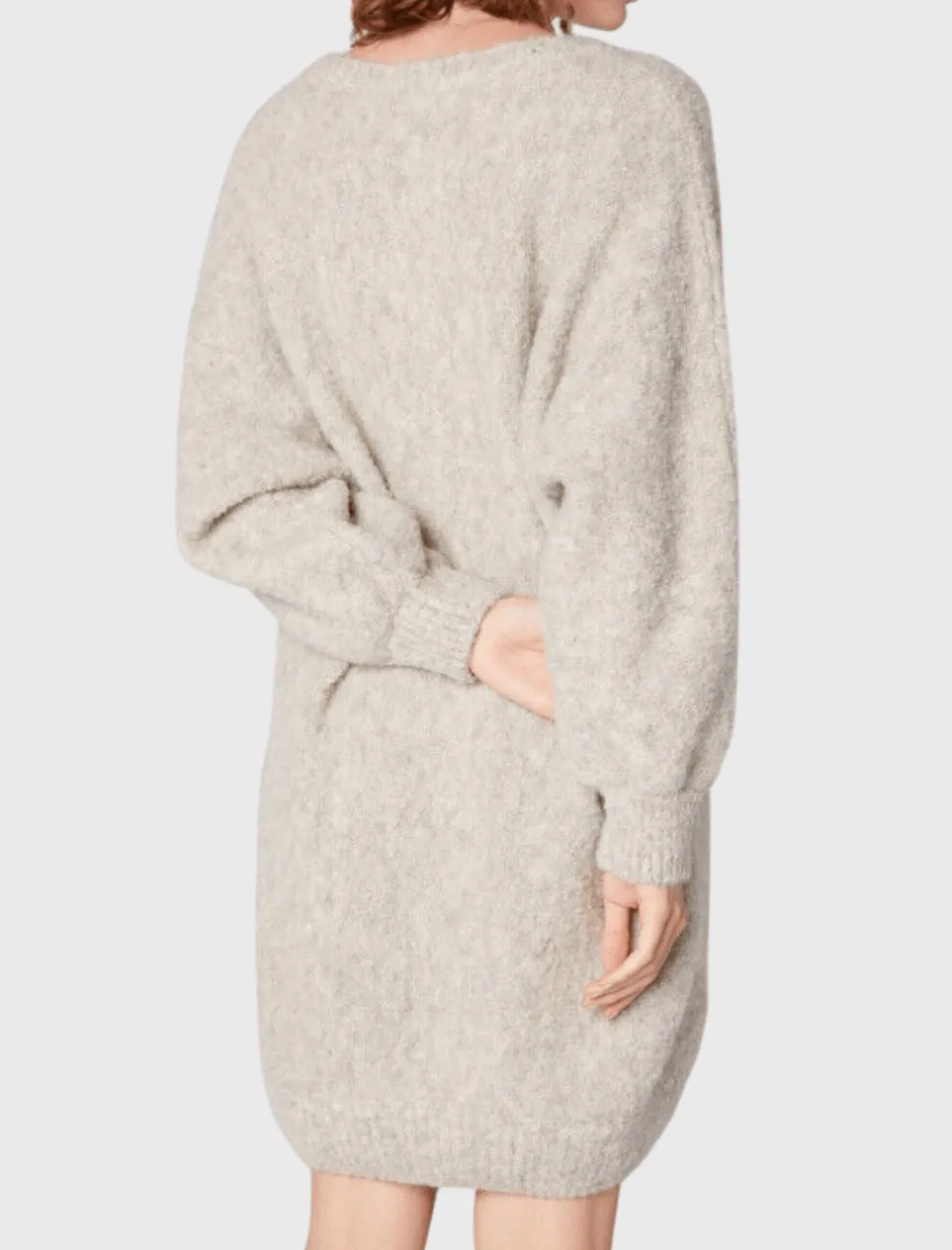 Relax in ultimate comfort in the Verywood Sweater Dress in Mist Melange from French fashion line American Vintage. Made from a fluffy Alpaca knit, this midi length dress with a V-Neckline and long sleeves is the ultimate lounge wear piece, throw it on top of some cotton leggings and a slouchy tank for the perfect around the house outfit.