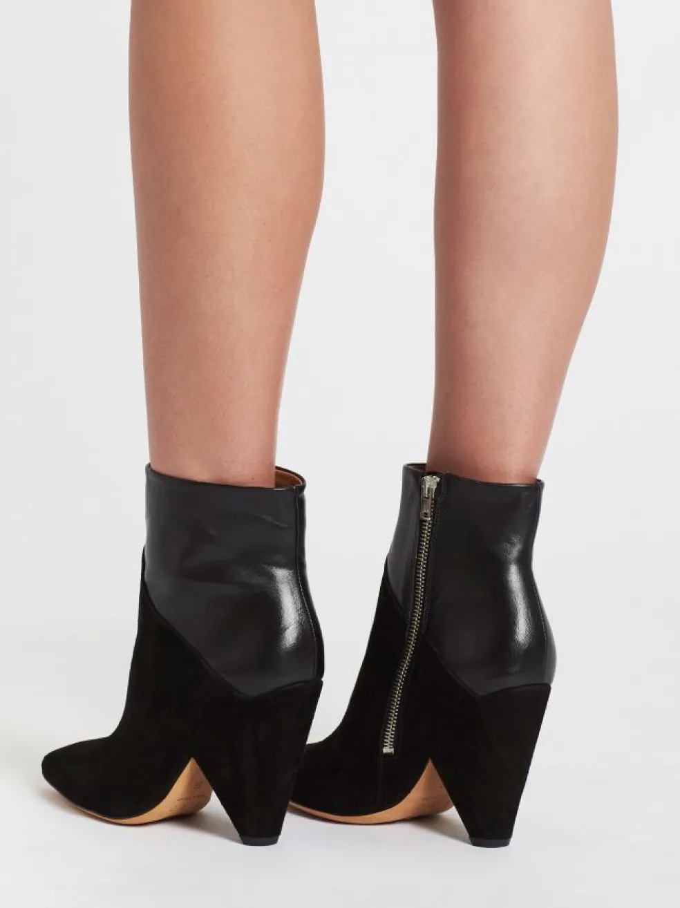 Put the right foot forward in IRO Vileana Boots in Black. Crafted in sturdy and comfortable leather, these mid heeled boots are comprised with contrasting textures of soft leather and suede and feature a pointed toe and chunky heel..