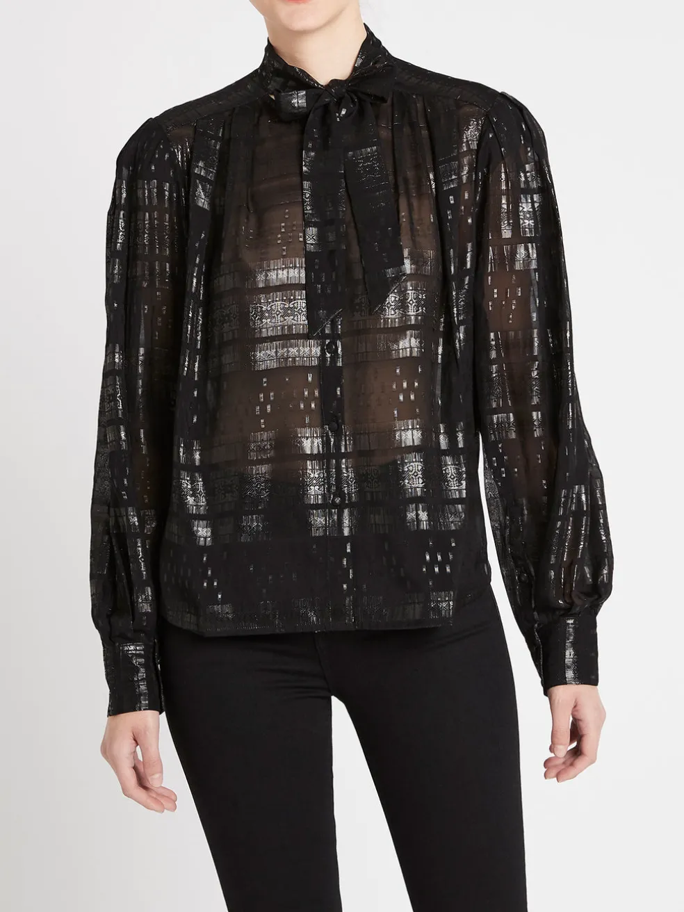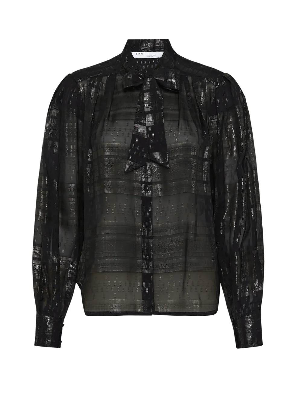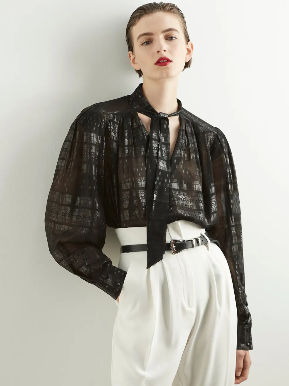 Build upon your capsule wardrobe with the Visaya Top in Black by IRO. This long sleeved blouse features and ultra luxe sheer sheen with a round neckline and button down closure and is finished with a versitile necktie for a more polished look. Team with a soft trouser and blazer for minimalist appeal.