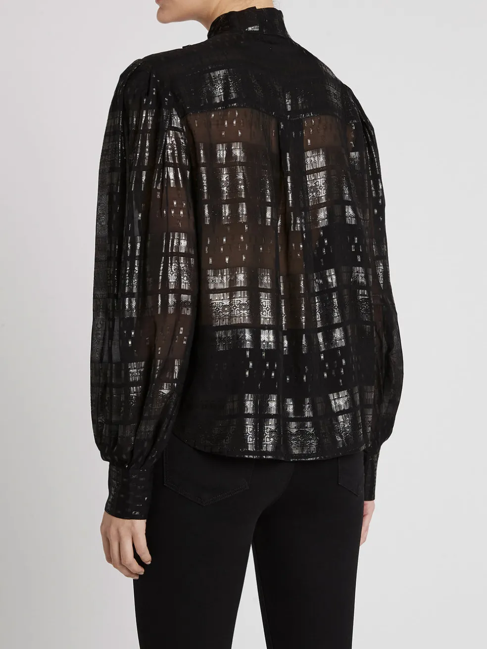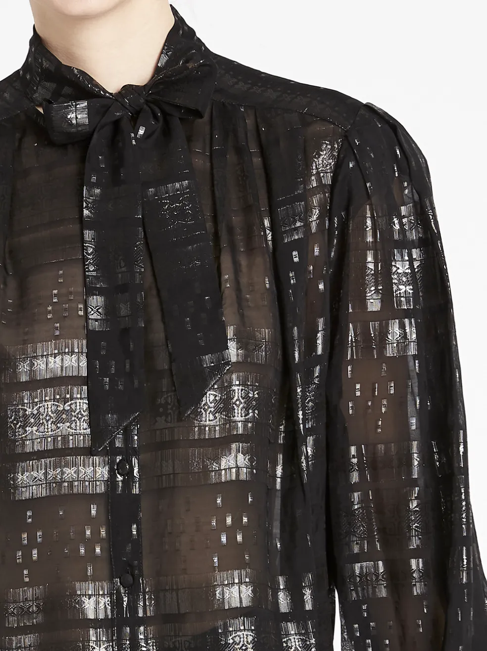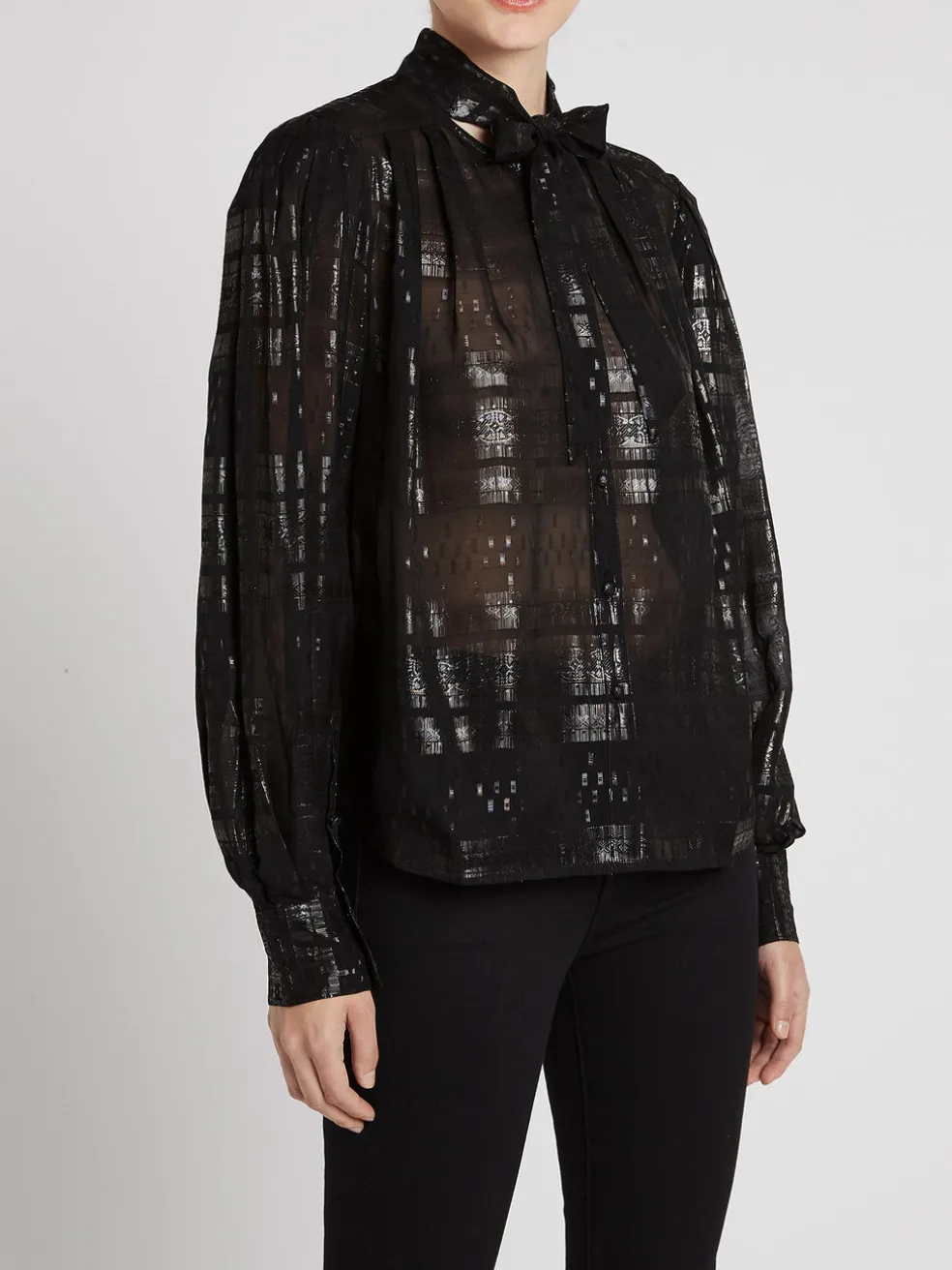 Build upon your capsule wardrobe with the Visaya Top in Black by IRO. This long sleeved blouse features and ultra luxe sheer sheen with a round neckline and button down closure and is finished with a versitile necktie for a more polished look. Team with a soft trouser and blazer for minimalist appeal.