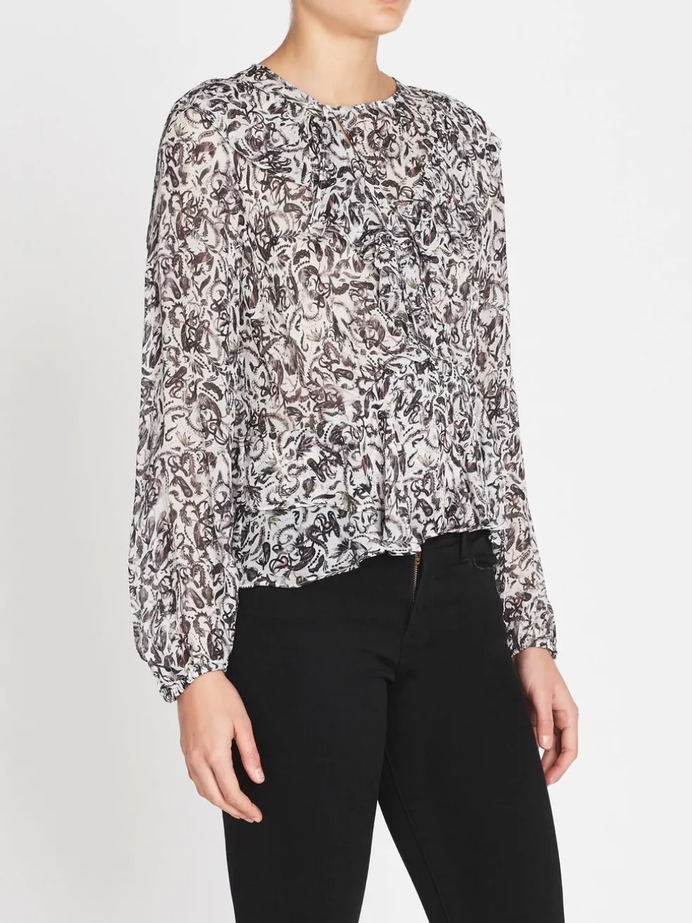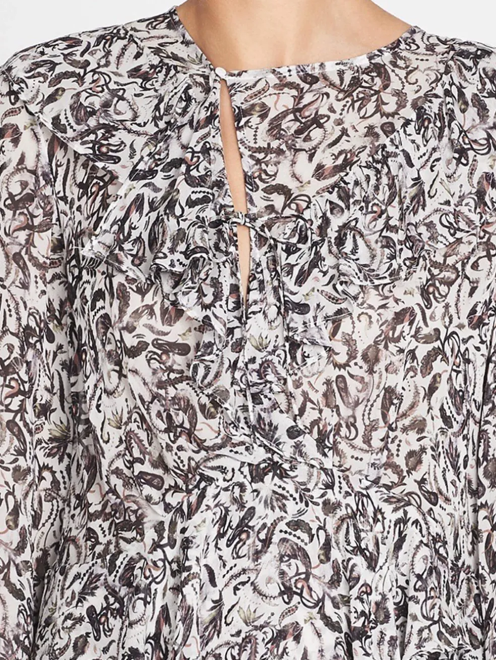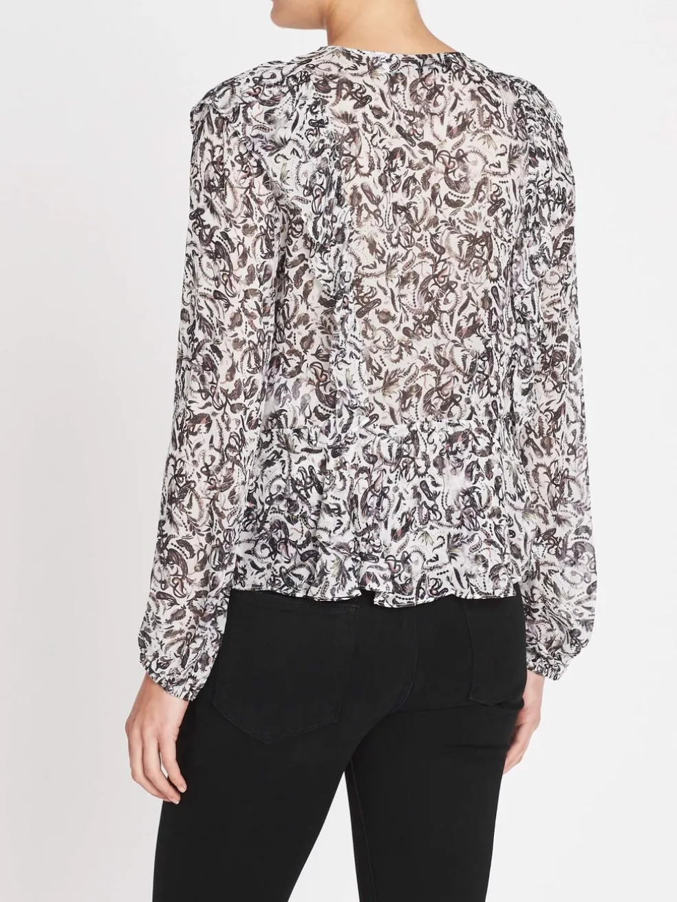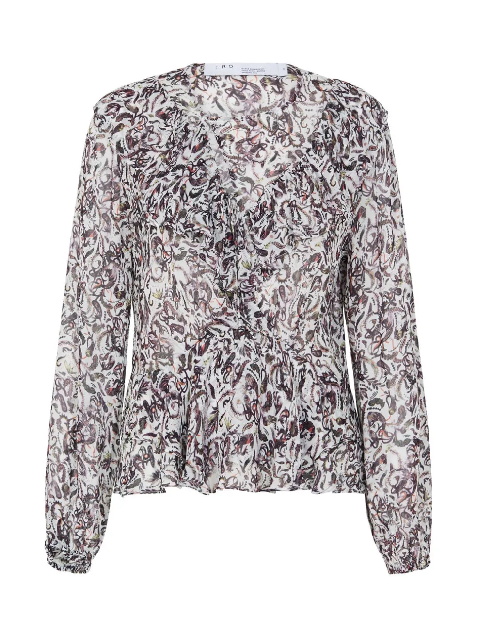 The IRO Voodoo Top in White is a stylish and chic blouse that is perfect for any fashion-forward wardrobe. The top features a mysterious dainty floral print that is inspired by 1970s paisley, creating an eye-catching and unique look. The long sleeves of the blouse add a touch of elegance to the design, making it suitable for both casual and formal occasions.
