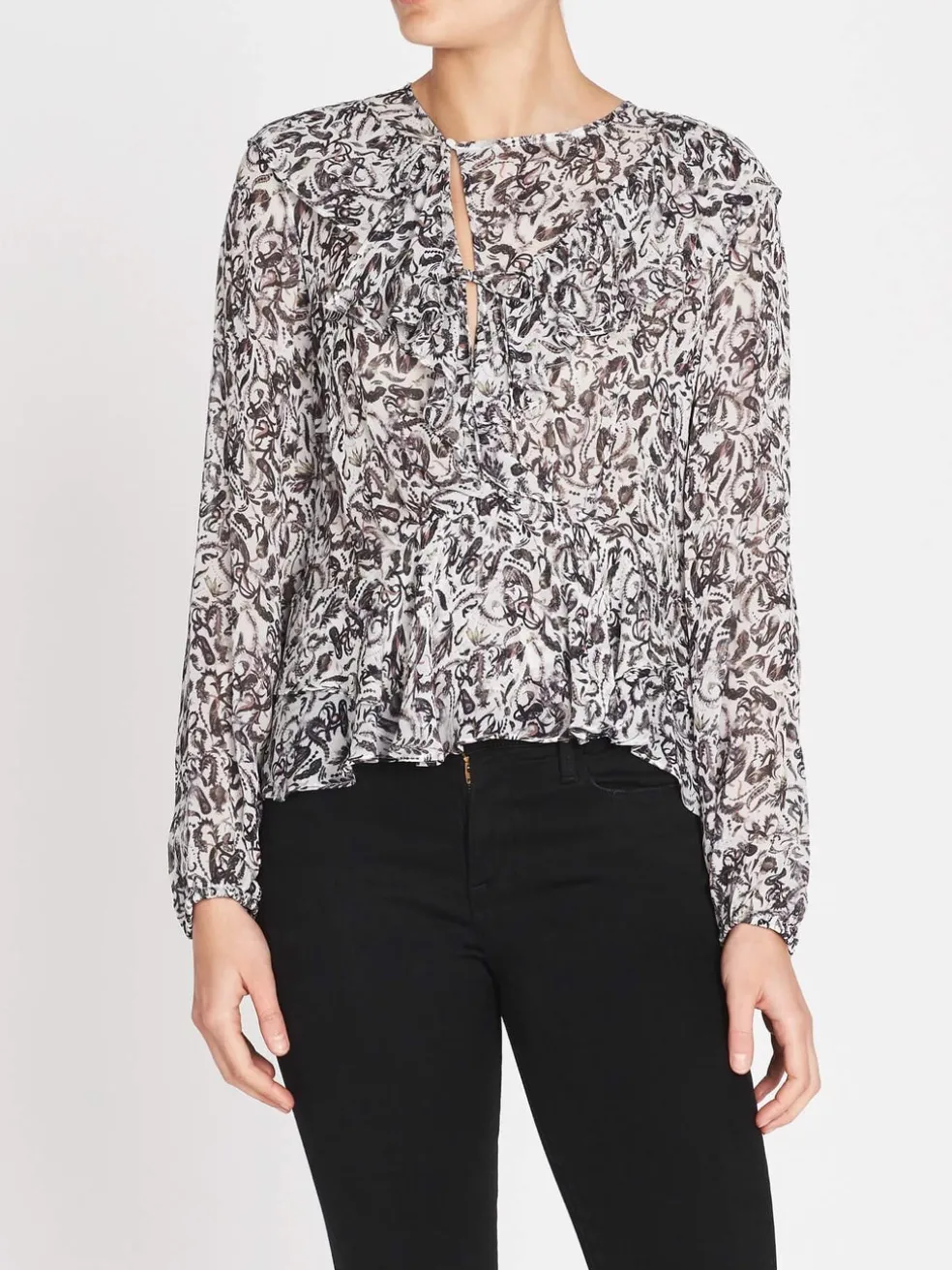 The asymmetrical tie-up neck opening of the blouse adds a playful and stylish touch to the top with a delicate frill trim, creating a flattering silhouette that is perfect for pairing with high-waisted trousers or skirts.