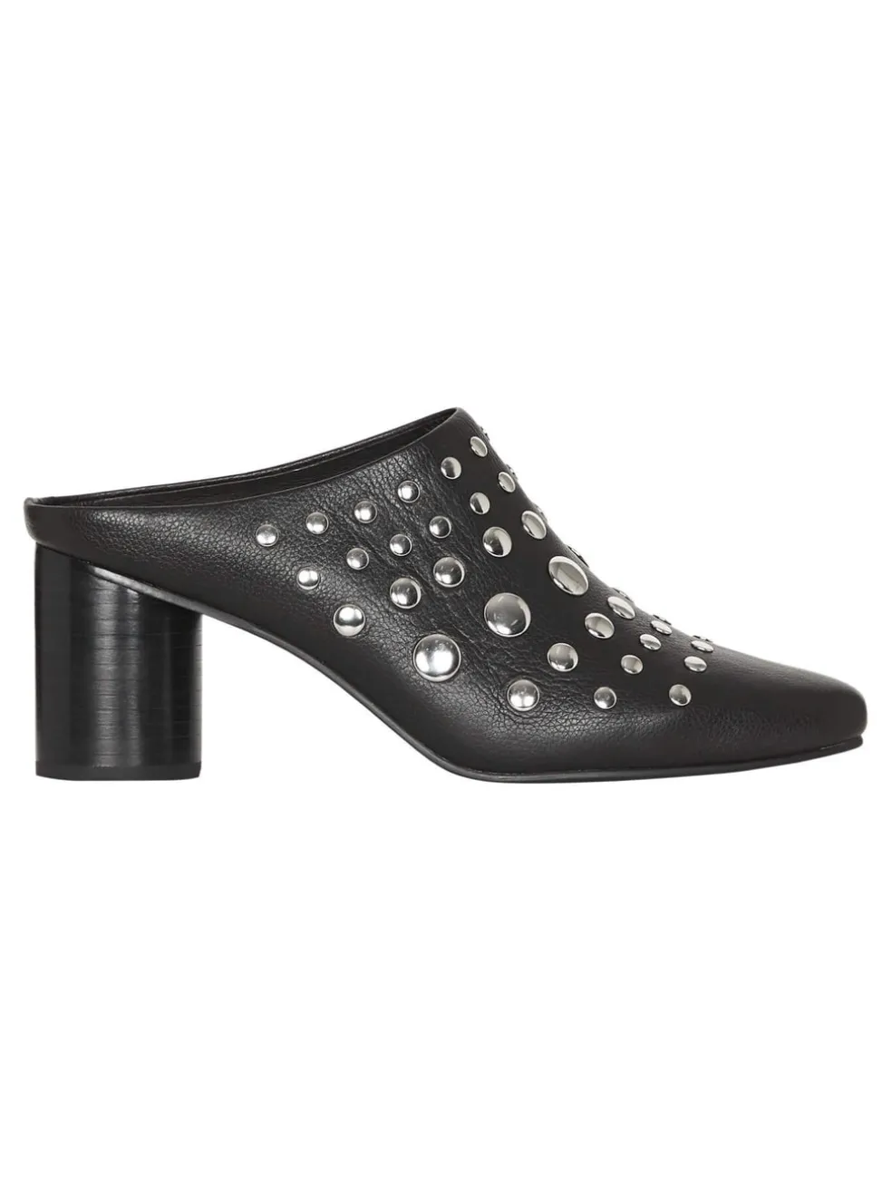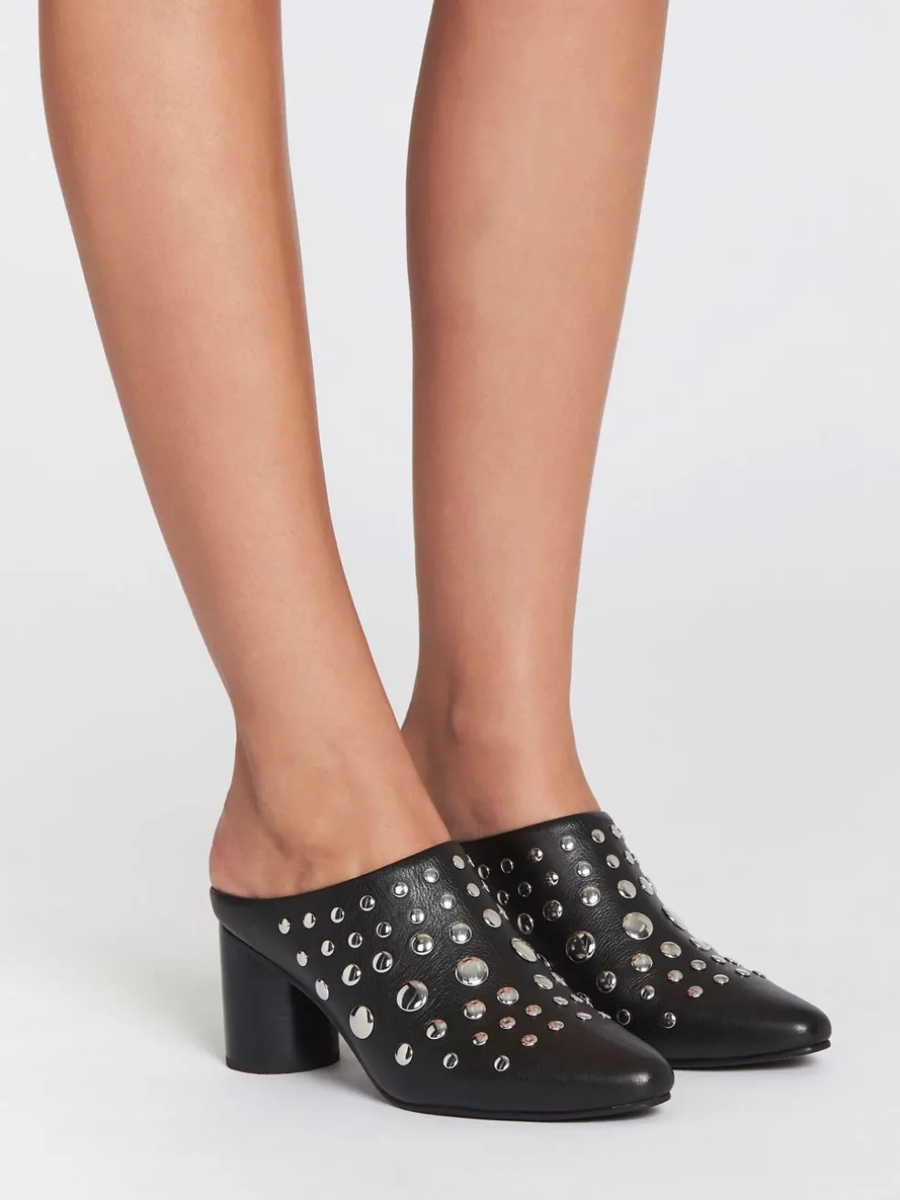 Constructed in a classic black leather the Wednesday Mule by Sol Sana is an easy addition for any wardrobe. Featuring a rounded point toe, open back, round stacked wooden heel and finished with silver stud details these ultra cool shoes can easily transition from day to night.