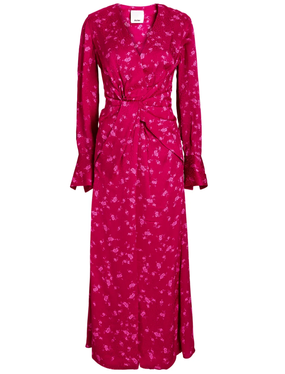 Acler’s stunning statement dress for the season is without a doubt the Wetherby Dress in Fuchsia. This long sleeved, midi length dress is designed to drape around the body in a relaxed silhouette. Featuring a gorgeous plunging neckline, flute cuffed tailored sleeves with gold button detail and twist detail at the front. Side zip entry with a centre back elastic waistband for a comfortable fit. The bright pink fabric features a delicate mini floral print on top of a spotted jacquard design for a attention grabbing look this event season.