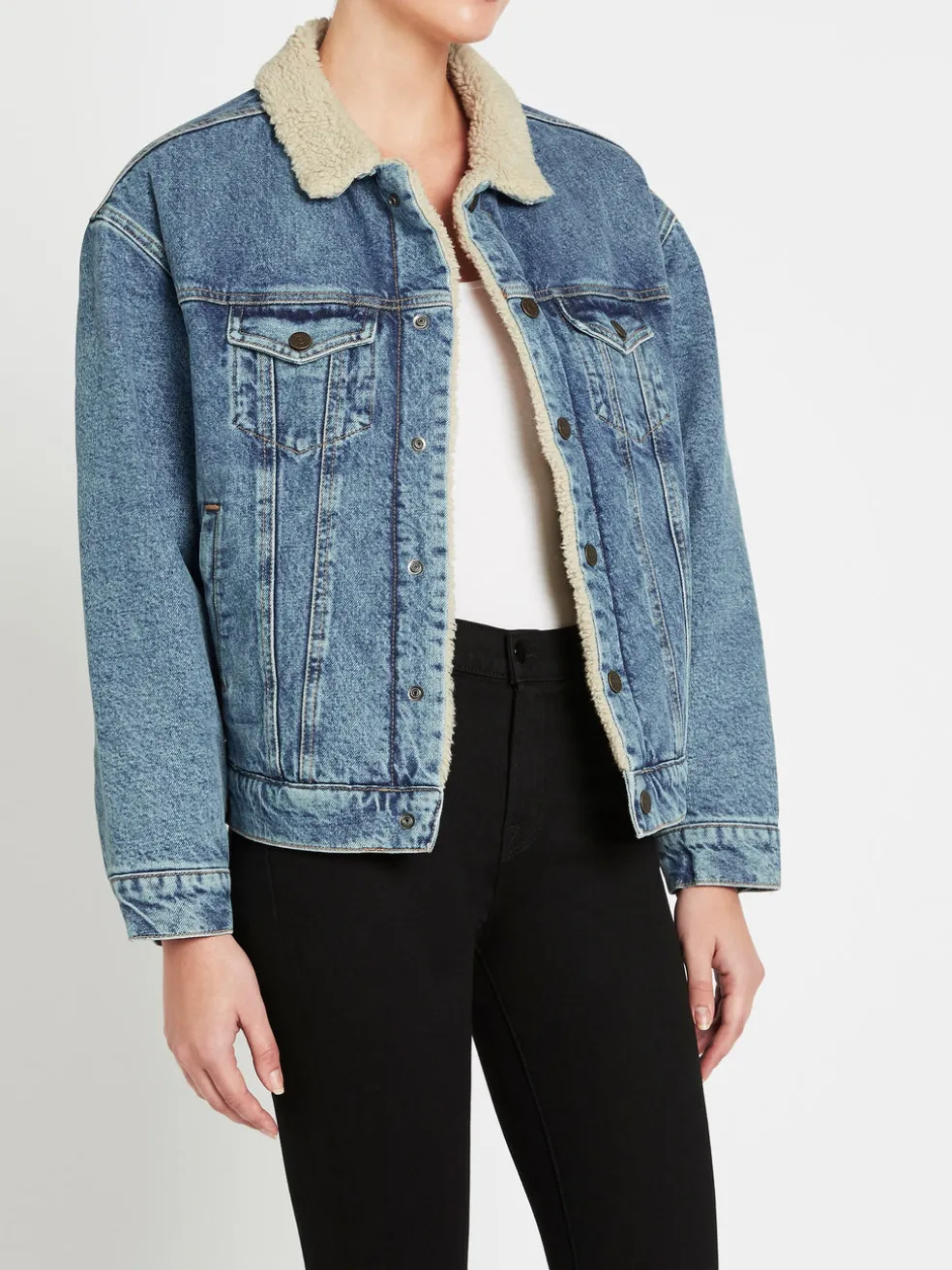 Take the much loved denim jacket into winter with the American Vintage Wipy Denim Jacket in Stone Salt & Pepper. With a classic blue denim outer and super warm faux shearling inner this must have piece features a centre front opening with snap button closure and is finished with breast and side pockets. Wear over a light knit with high rise black denim for easy winter style.