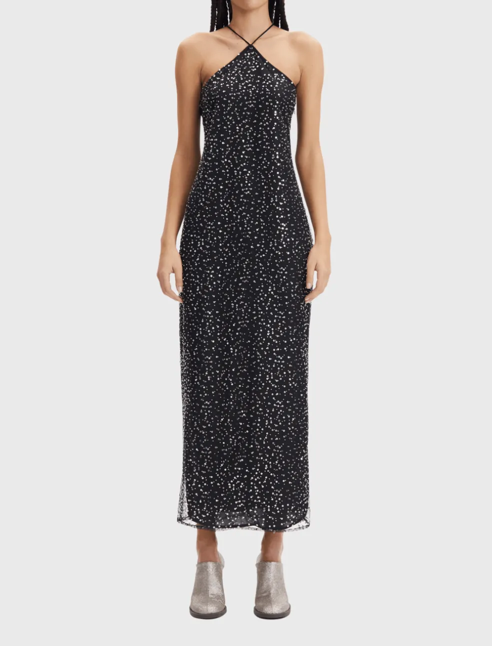 You’ll sparkle like the night sky is the striking Ytzen party dress from Samsoe Samsoe. This midi dress is a reinvention of a classic halter style with thin spaghetti straps and a revealing cut away back shoulder. This gorgeous column shaped dress hits just above the ankle and is the perfect style for a chic party look this holiday season.