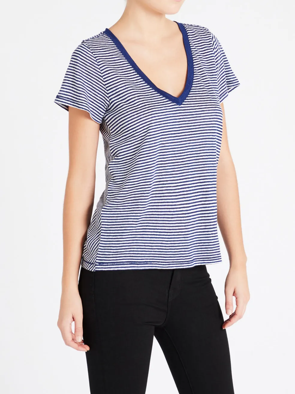 Loosen up with the Zaya Tee in Dark Ink Blue/White stripe from Paige. In a V neck shape with a contrasting neckline and exposed stitching, the Zaya Tee is made from a smooth linen material and teams to perfection with your favourite pair of denim jeans.