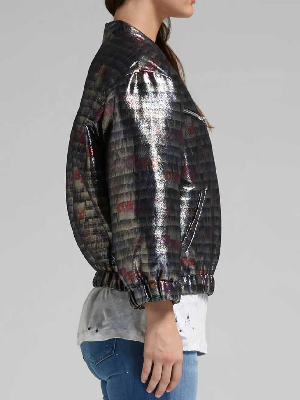 The Zina Bomber Jacket from IRO is the statement piece of the season. This multicolour cropped style bomber is made from a stunning metallic fabric, is fully lined and features chunky silver zip hardware on the centre front and front pockets.