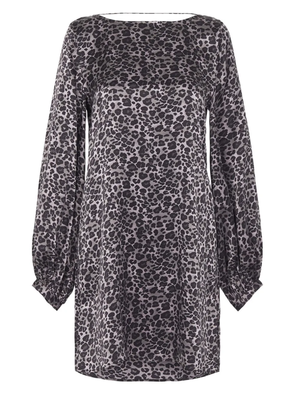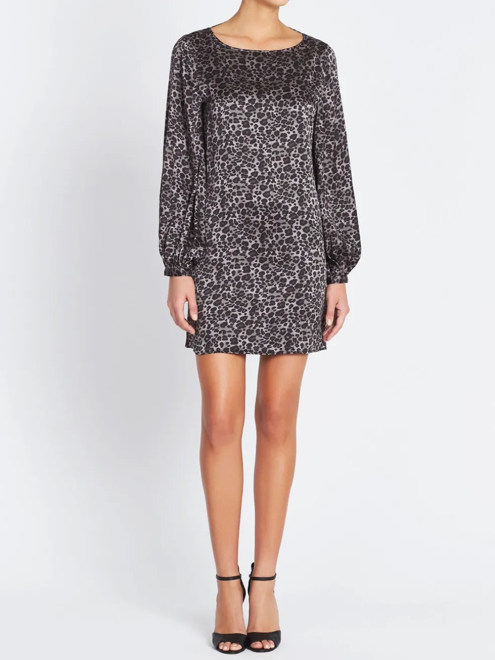 The Equipment Zipporah Short Dress in Silver Steel Multi is an easy to addition to any wardrobe. Constructed from an animal printed silk this lightweight mini dress features a round neckline, back v opening and long sleeves finished with subtle gathering at the single buttoned cuffs. Wear yours alone with your favourite strappy heels or layered over leather leggings and little black booties.