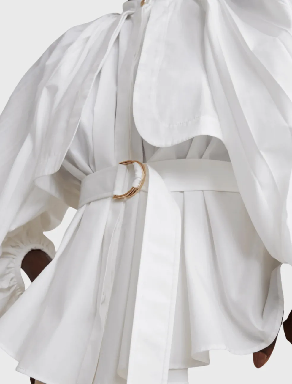 The architecturally inspired Ivy Shirt from Adelaide based design house Acler is a artful re-invention of a classic white shirt. Made from a crisp linen blend fabrication, the shirt has a charming pleated balloon style bracelet length sleeves, a priest’s collar with gold button detail and loose lapel panels that create a layer of sculpture. The shirt is completed with an adjustable belt to cinch the waist in. Signature pleating adds texture to this elevated style.