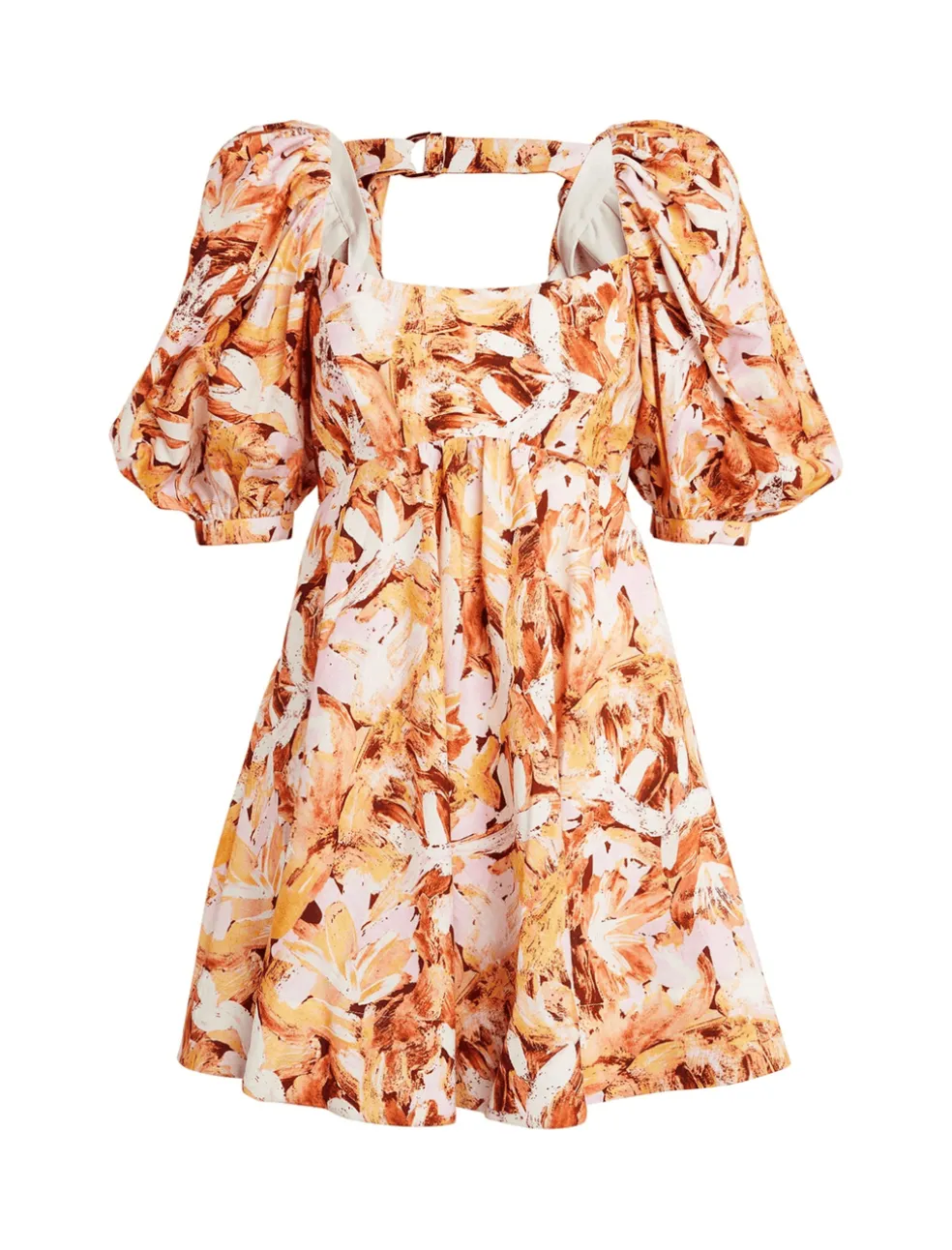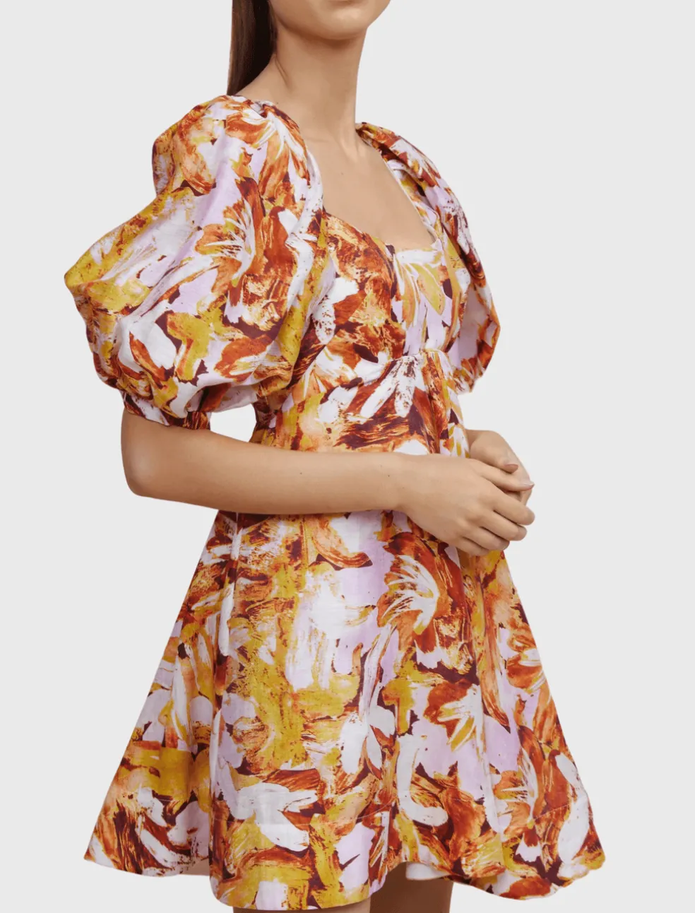 The stunning Octavia Dress by Acler is a floaty feminine mini dress in a romantic lilac, orange floral print inspired by sunsets and falling leaves. The dress features billowing elbow length sleeves, and fitted bust and empire waisted skirt in a fit and flare style. The back of the dress showcases your shoulder blades with a pretty cut out, held tight with a strap and signature gold hardware buckle closure. The dress is fully lined and closed with a centre back zip.