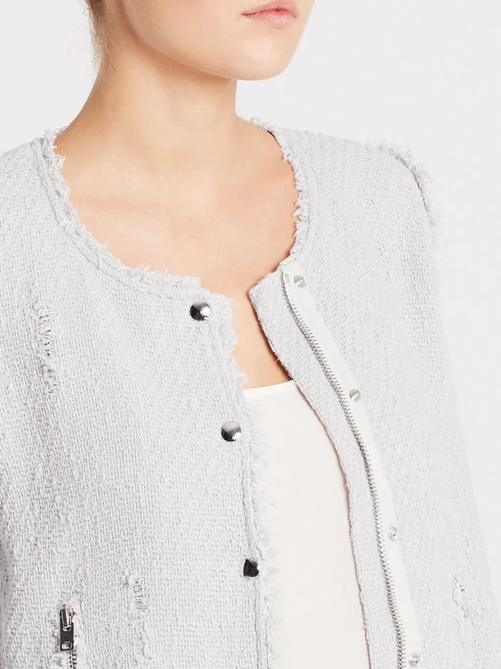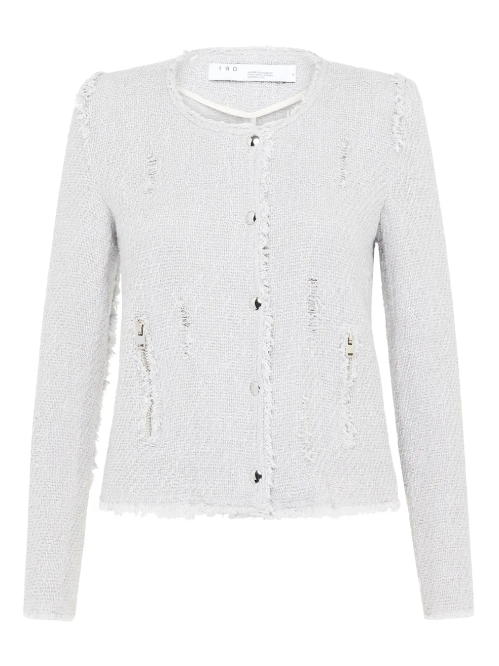 The sophisticated Iro Agnette button down jacket from IRO is back again, this time in the colour Light Grey. This coveted style has frayed edges and seams. Featuring a hidden zip and stud closure, shredded accents and shoulder padding, this collarless jacket is a must have wardrobe staple.