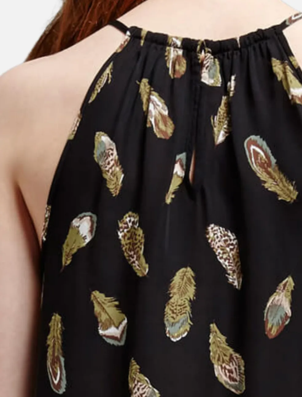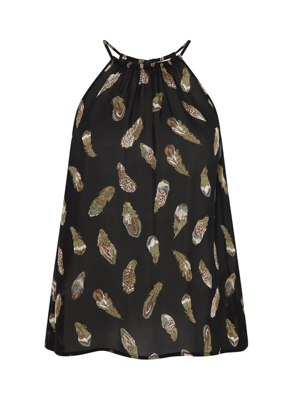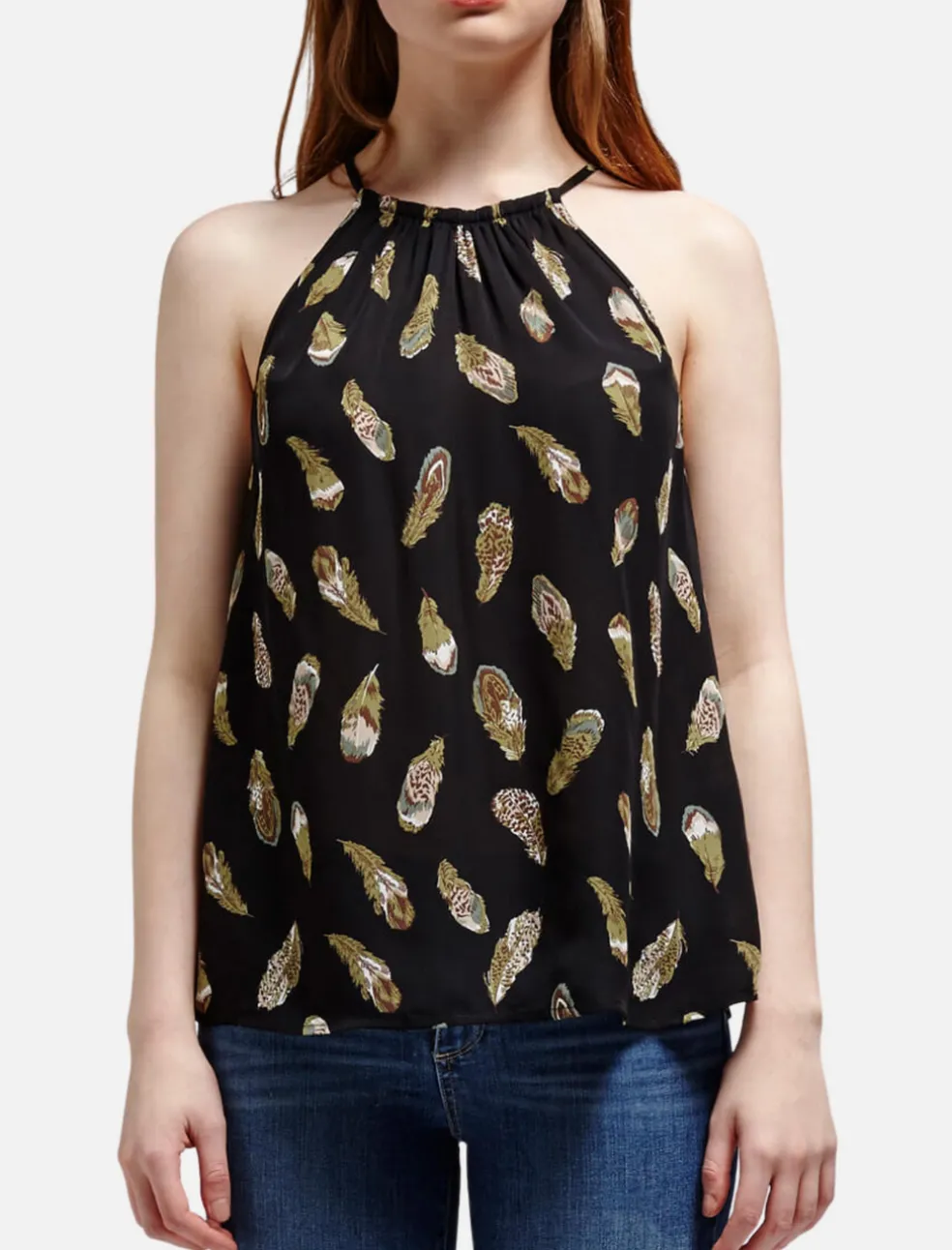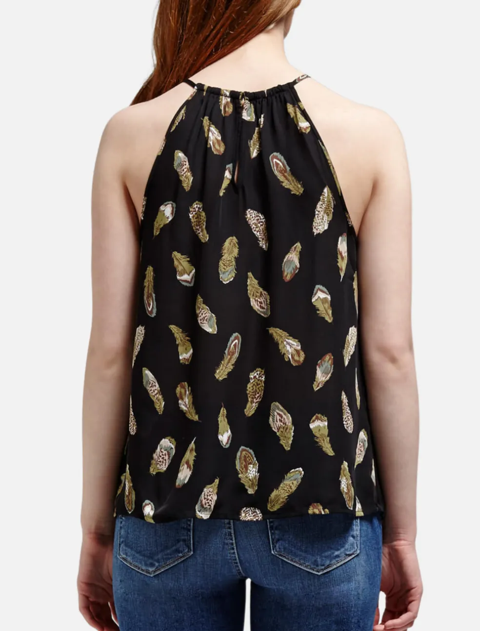The Alabama Halter Neck Tank from Joie is a beautiful matte black Silk tank that features an illustrated floating feather design. This tank is feminine and flowy, and has a gathered halter neck with thin straps. A relaxed fit, this tank also features a back keyhole detail.