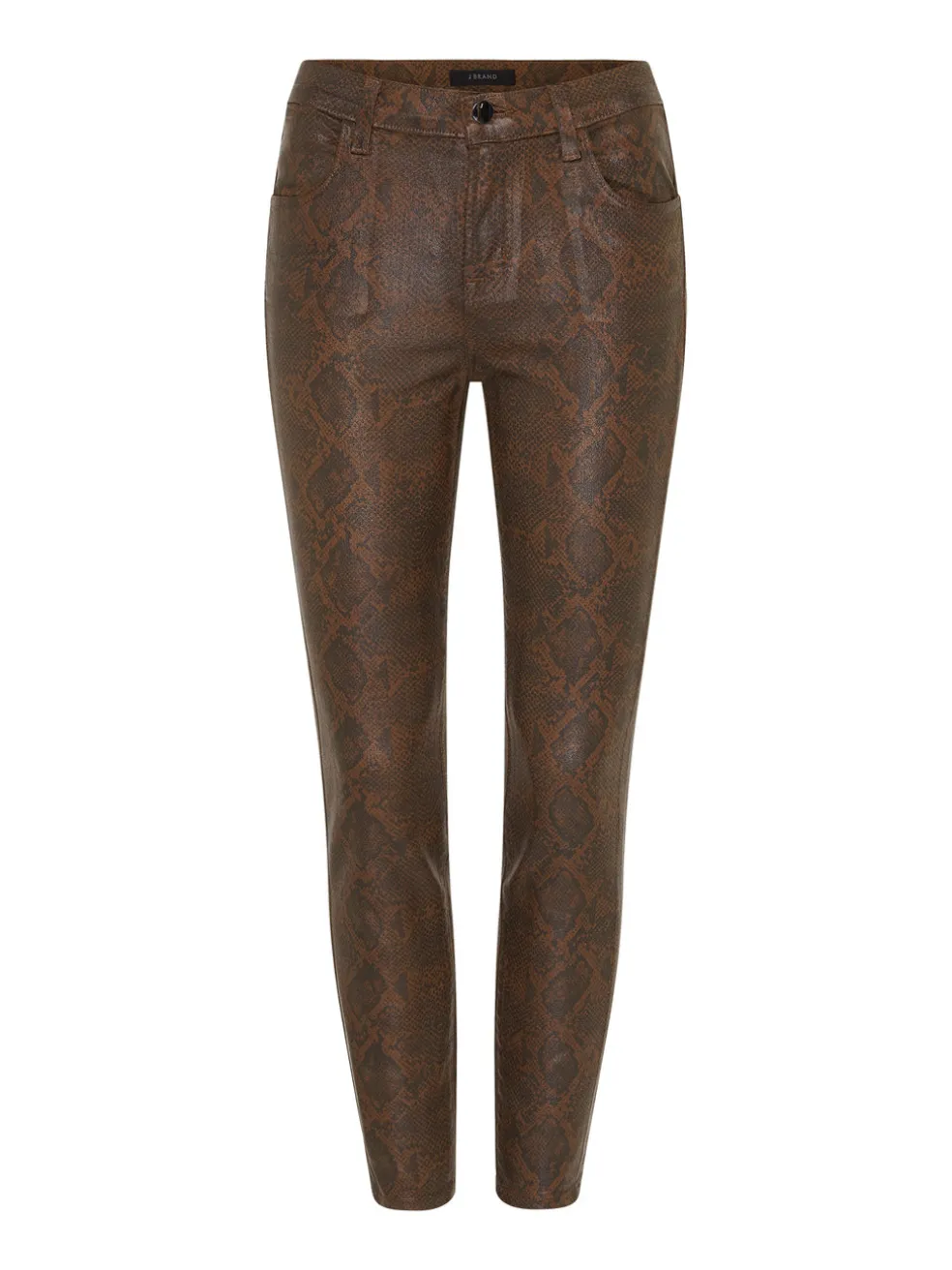 Take a walk on the wild side in the J Brand Alana High Rise Crop Skinny Jean in Dark Eclair Coated. The much loved Alana Jean features a high rise, single button zip fly closure, front and back pockets and a cropped hem. This snake print coated style is an easy way to elevate a simple black tee and is perfect paired with a black leather boot.