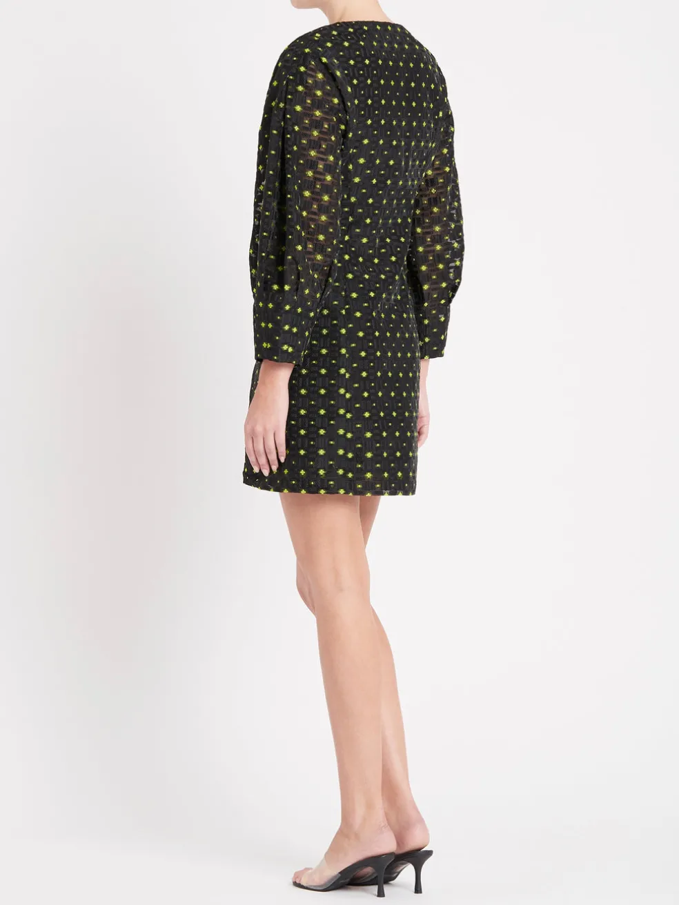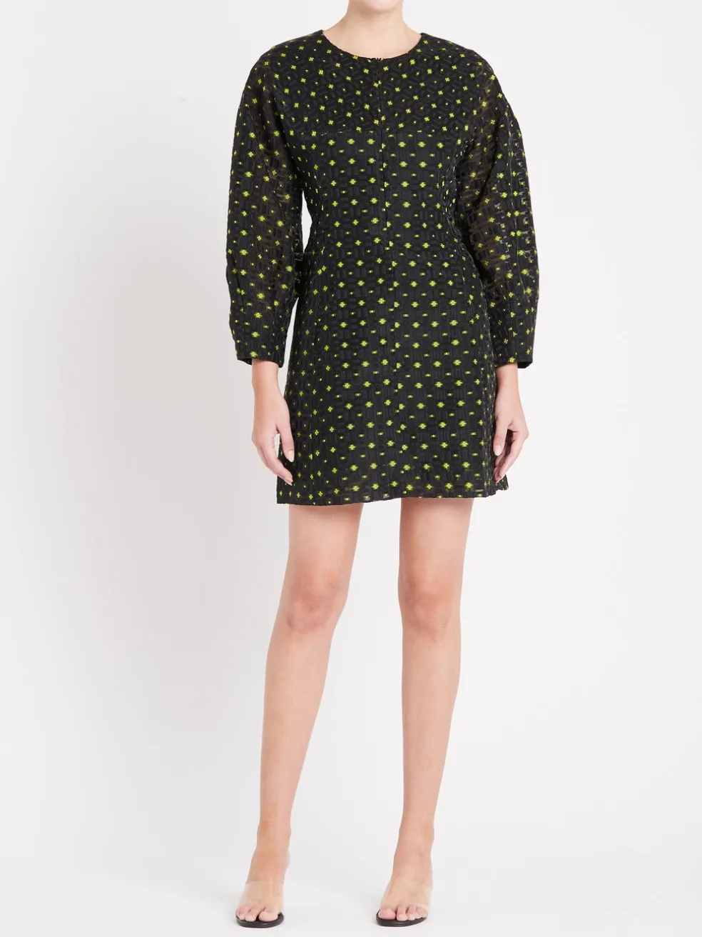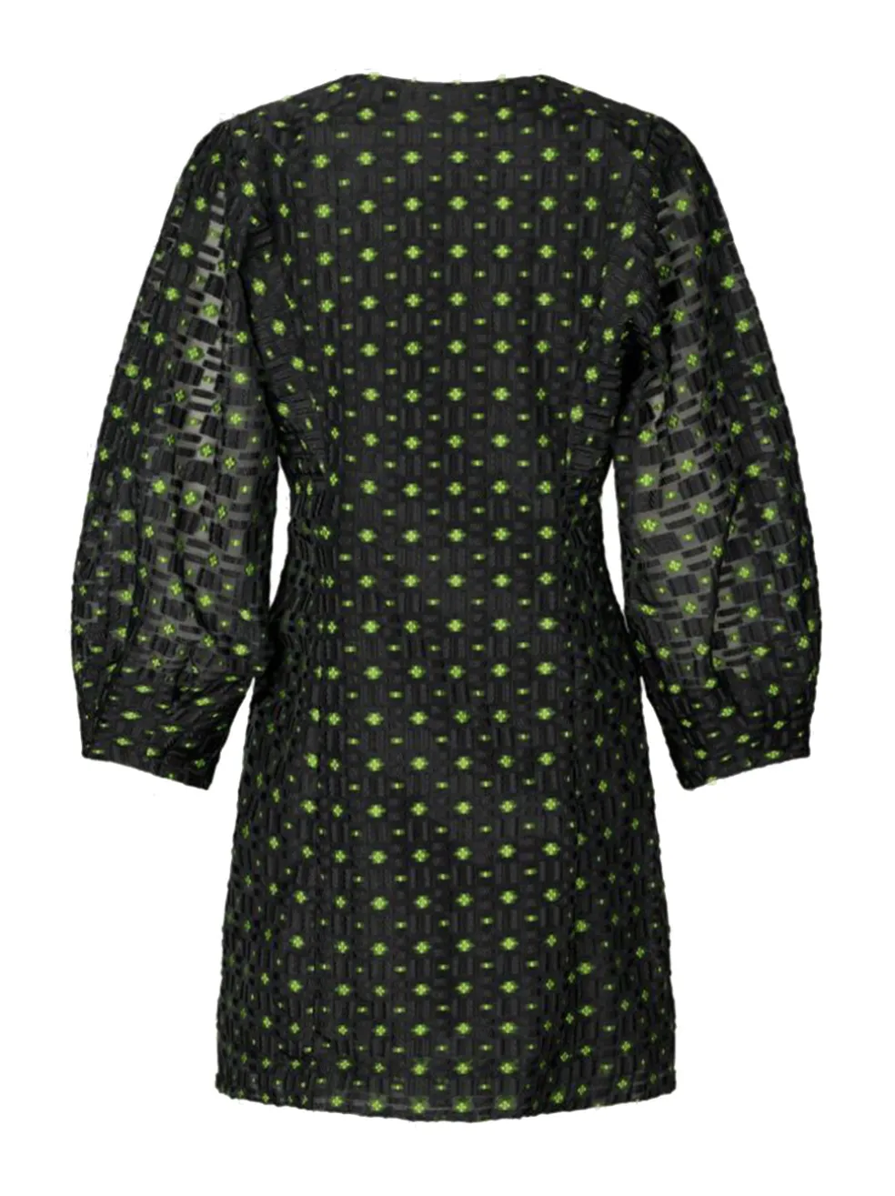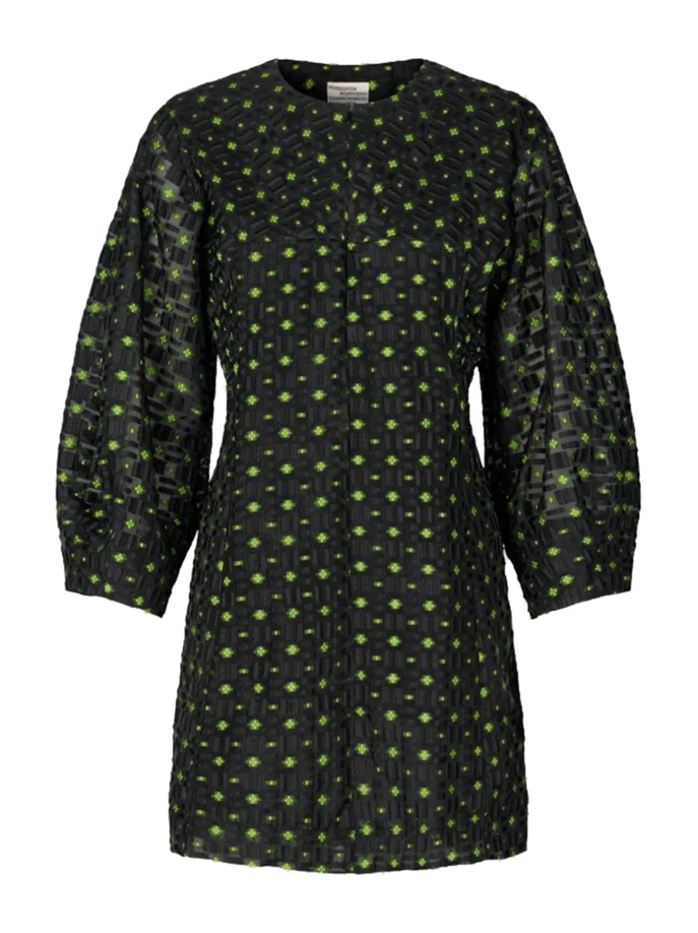 The perfect winter mini dress is here with the Baum Und Pferdgarten Amina Dress in Black Star. Constructed from recycled polyester this pieces features puffed, sheer bracelet length sleeves, a round neckline, embroidered overlay with contrast neon green stitching, a sewn in lining and an invisible zip at the centre back.