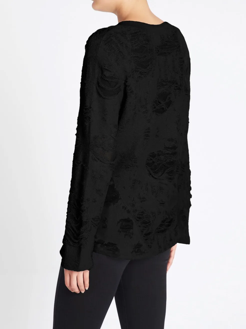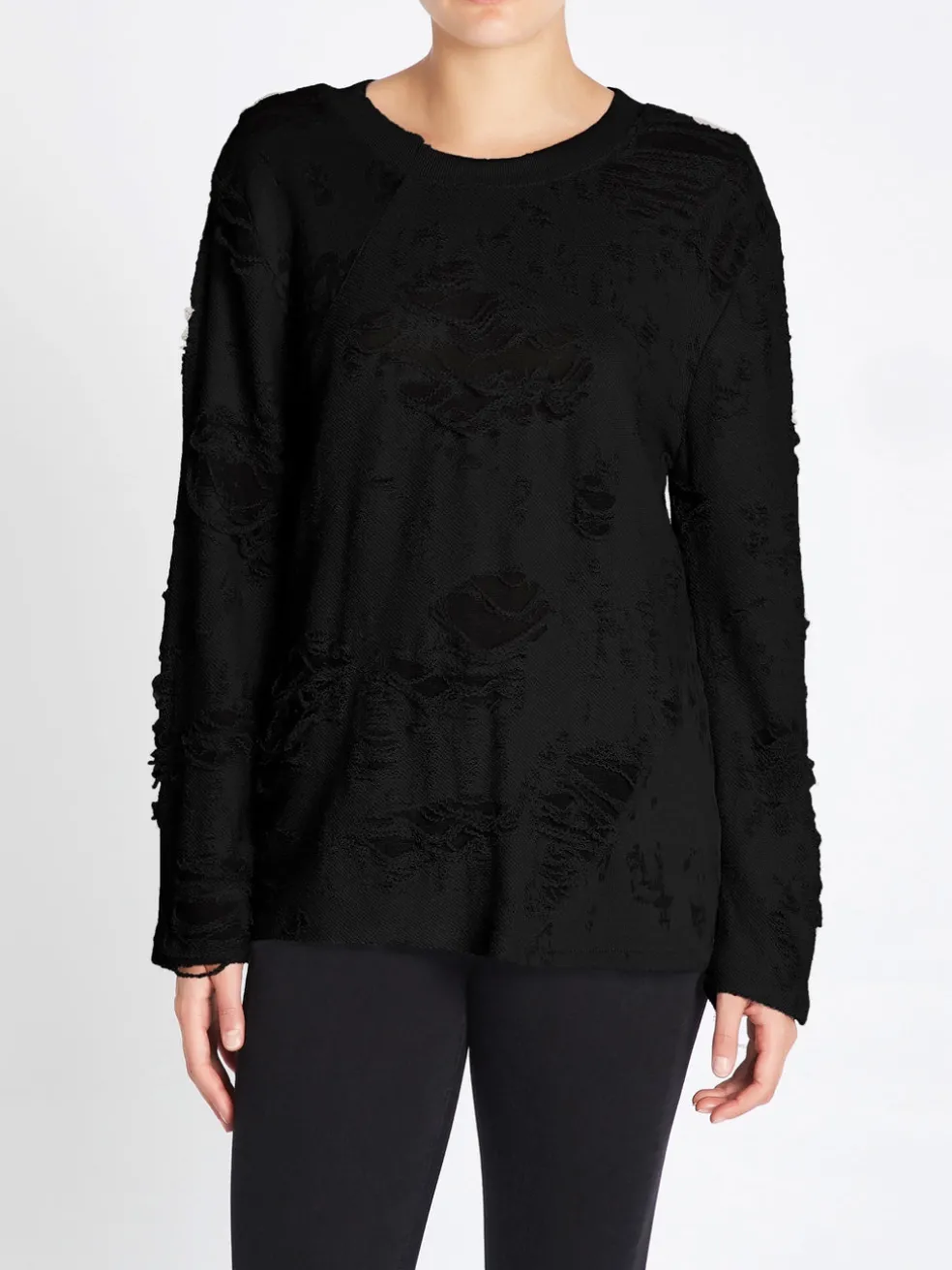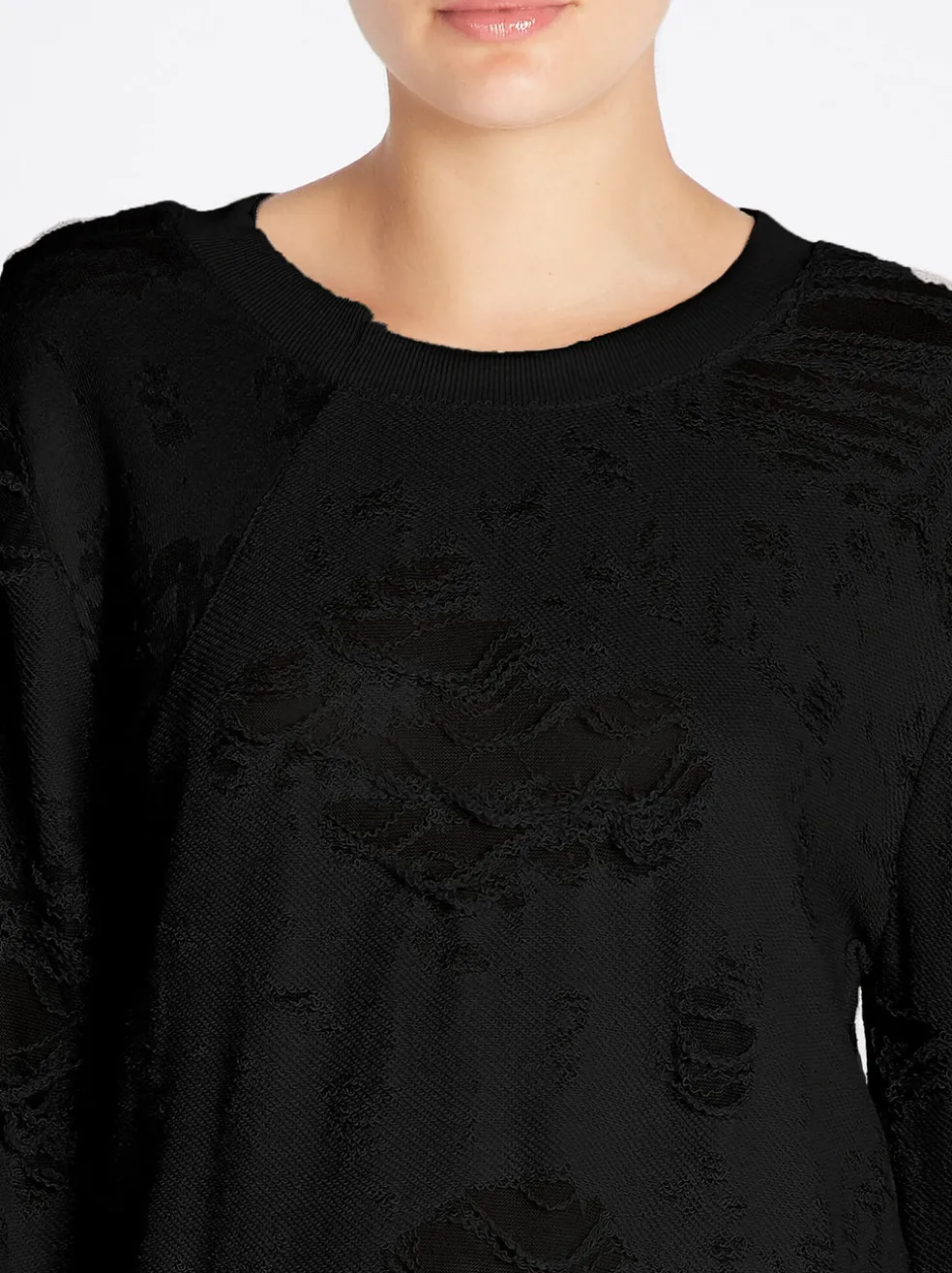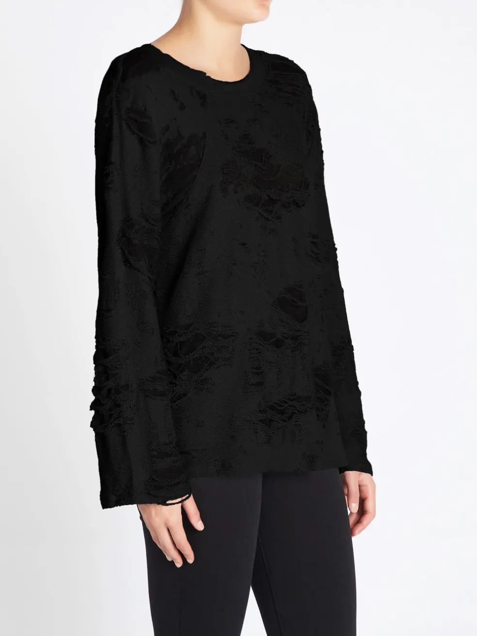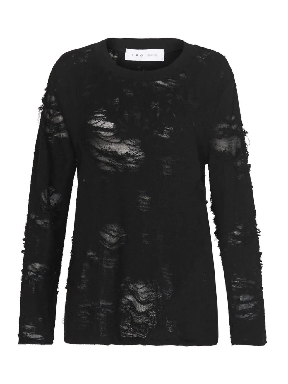 A distressed sweater with an asymmetric raw cut hem, the Anile Top from IRO Jeans has a banded crew neck and long sleeves. Here in Black, this piece is composed of french terry fabric.