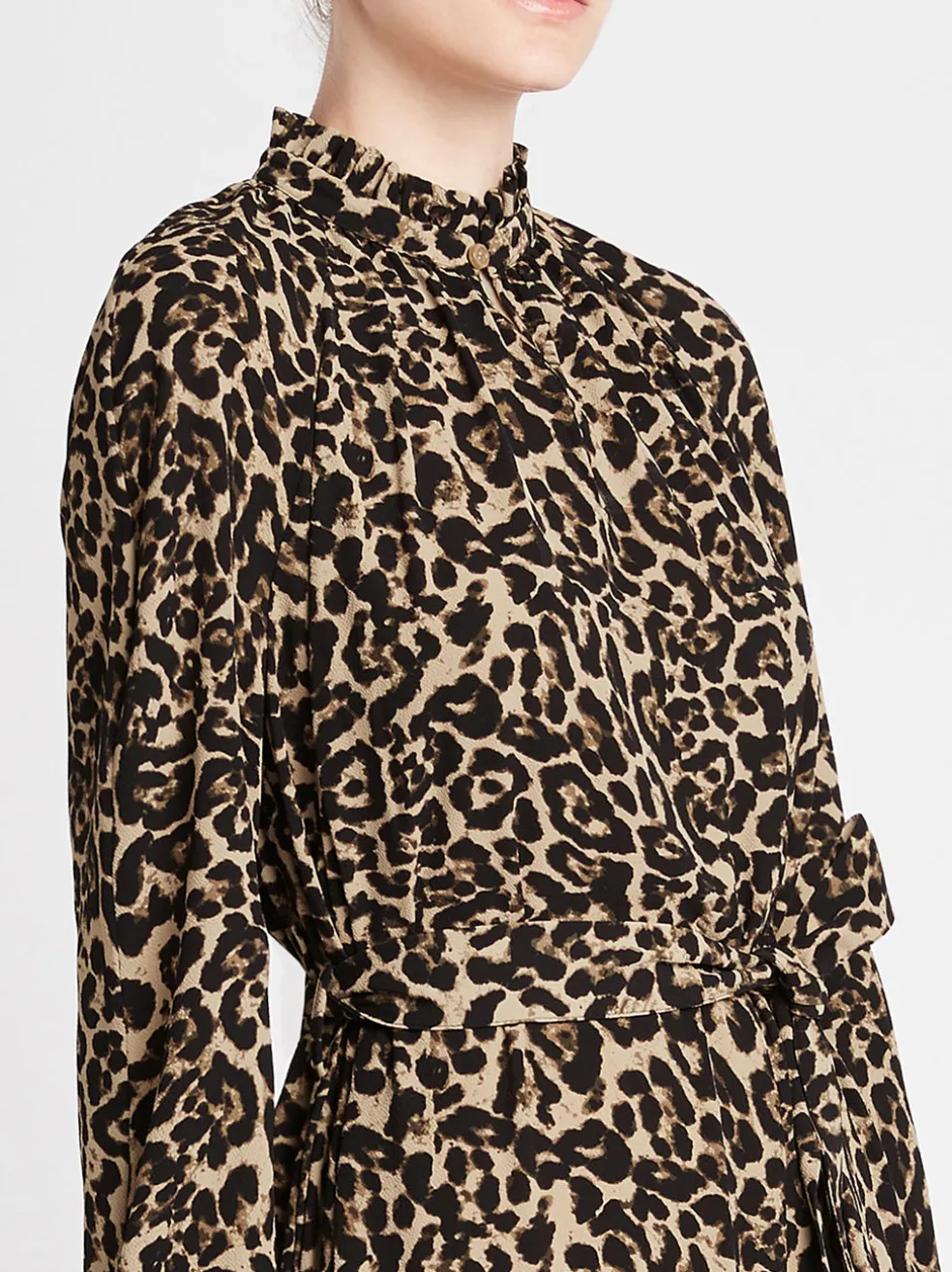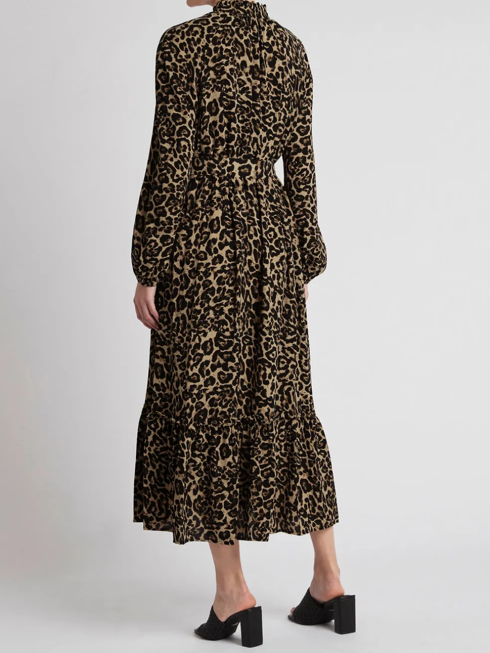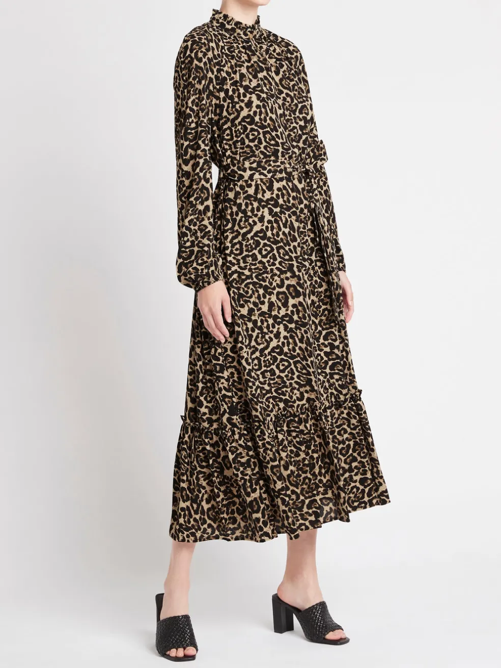 The long sleeved midi dress is a must have addition to your wardrobe this season and the Baum Und Pferdgarten Antoinette Dress in Natural Leopard is the perfect piece. Constructed from a recycled polyester this dress features a high round neckline with keyhole button closure, a tie cinch waist, long sleeves with an elastic finish and a tired gathered hem for a romantic finish. Team with heeled black boots and a cross body bag to complete the look.
