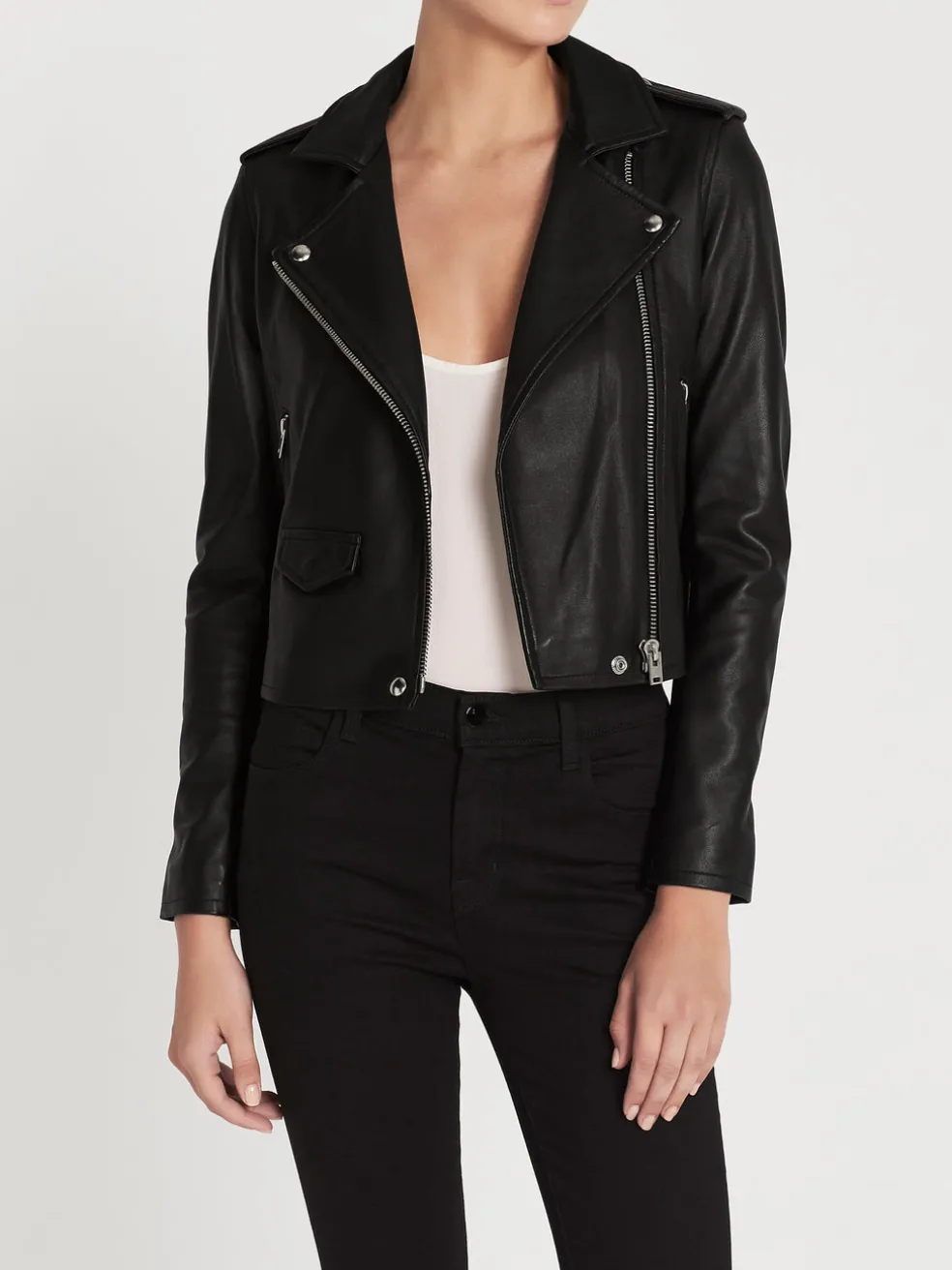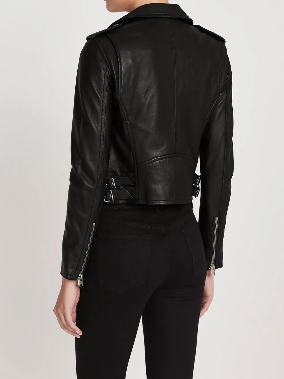 IRO does it again with the must have Ashville Biker Leather Jacket in Black. This super soft leather jacket features twin adjustable fixed waist belt buckles, a small triangle pocket on the front, snap-fastening epaulettes, and classic silver hardware. Fully lined.