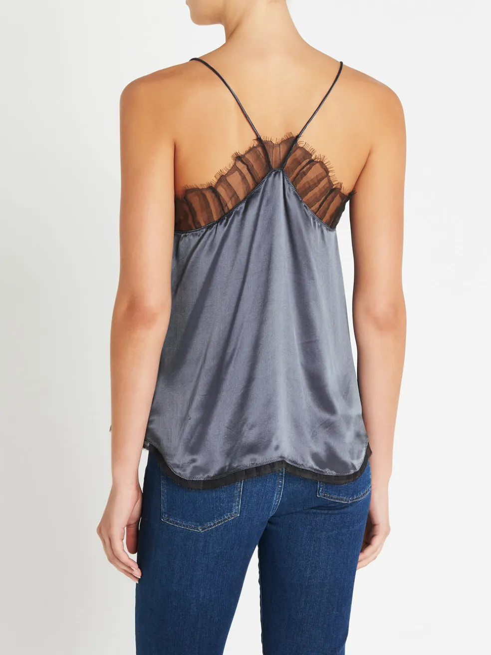 The perfect little cami to spice up your wardrobe. The Berwyn Cami by IRO is constructed from an ultra soft and lightweight silk and comes here in the colour grey; this camisole features a draped silhouette, spaghetti straps, v neckline and racer back. Lace trims adorn the neckline and scalloped hem to finish the piece. Wear yours over a black bralette tucked into a leather skirt or slip over a simple tee with jeans for a more casual look.