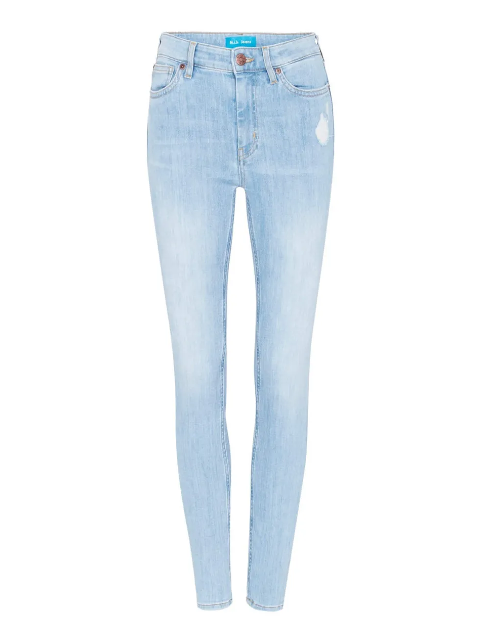 The M.i.h Bridge Jean in Jackie is the perfect skinny leg high rise jean coming in a classic sky blue. Constructed from a super comfortable, stretch cotton blend these jeans feature a single button zip fly closure, front and back pockets, bronze hardware and is finished with a small distressed patch at the left hip.
