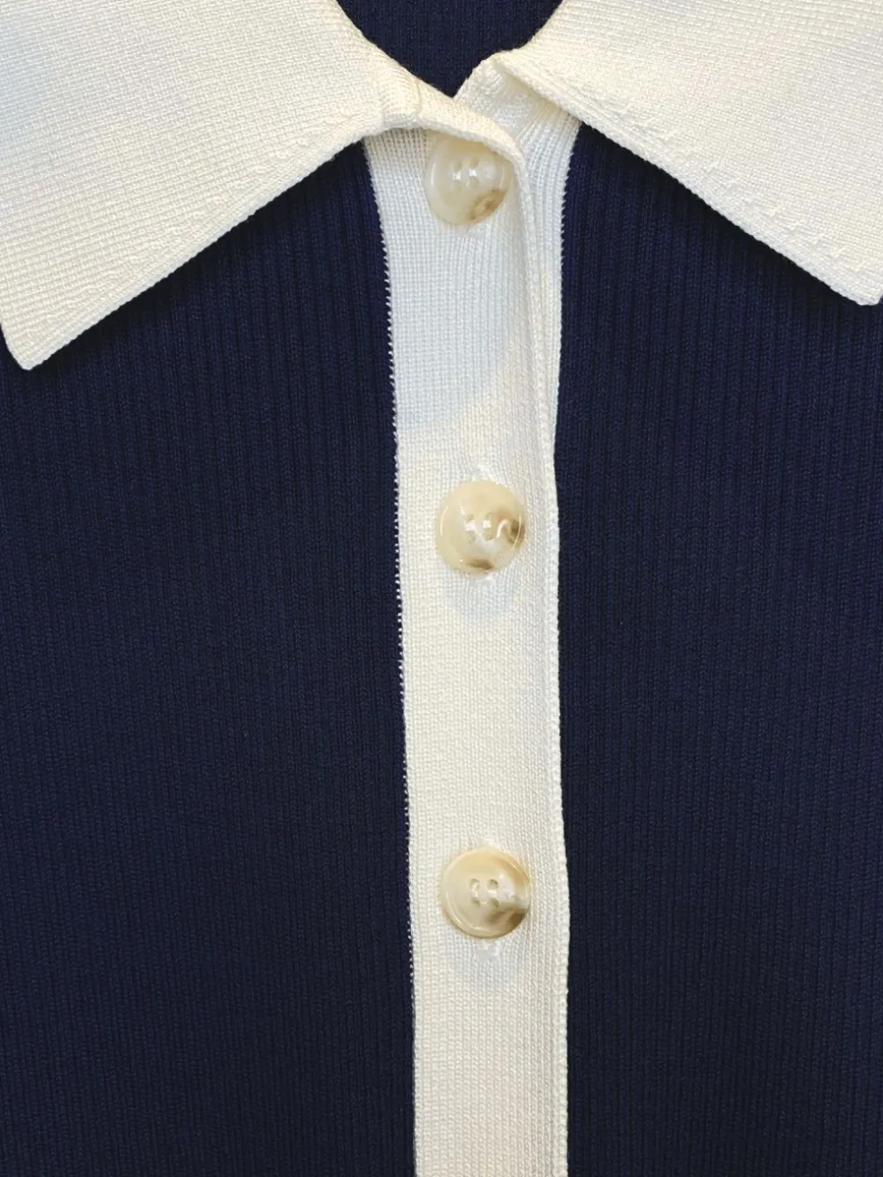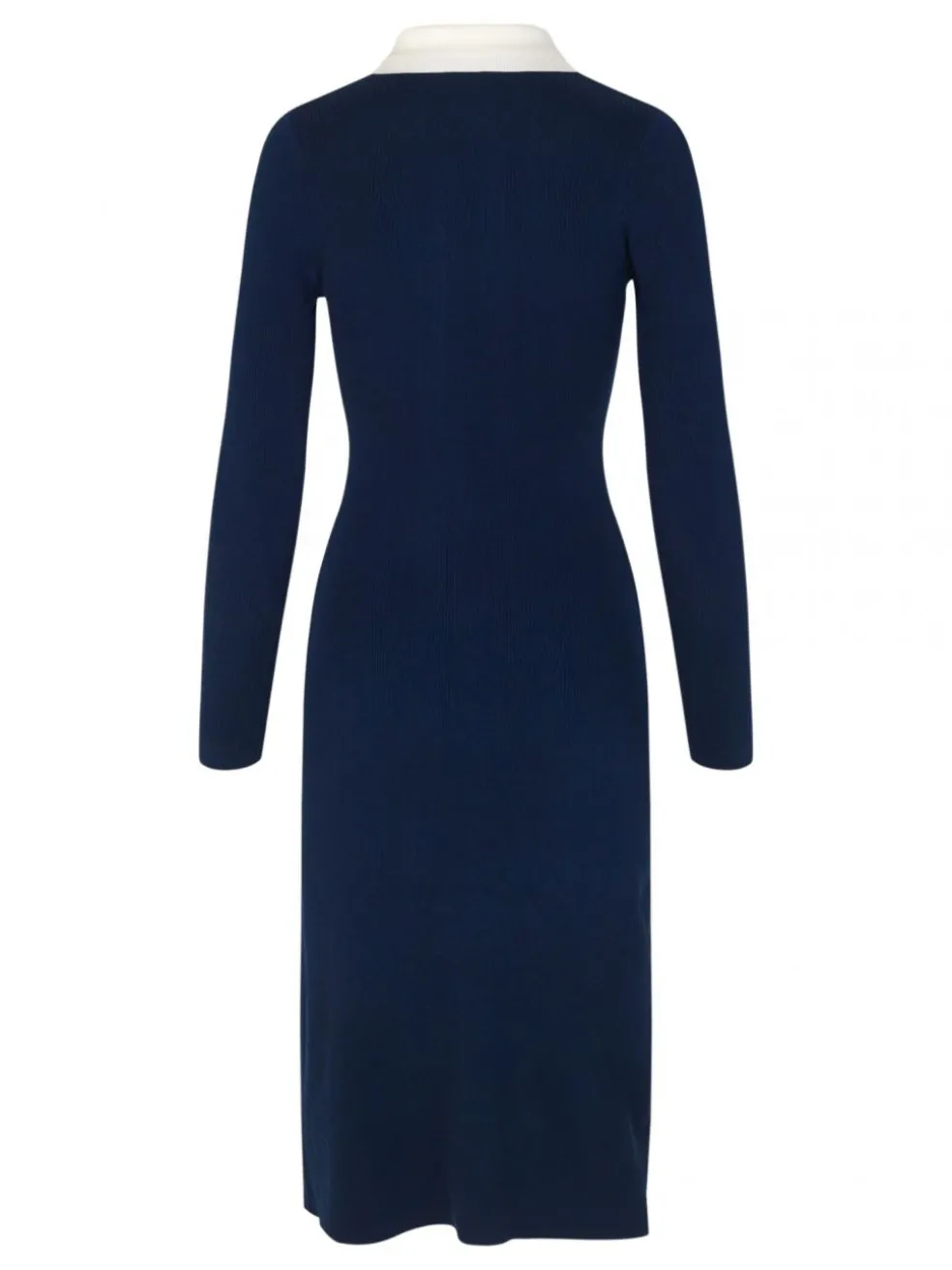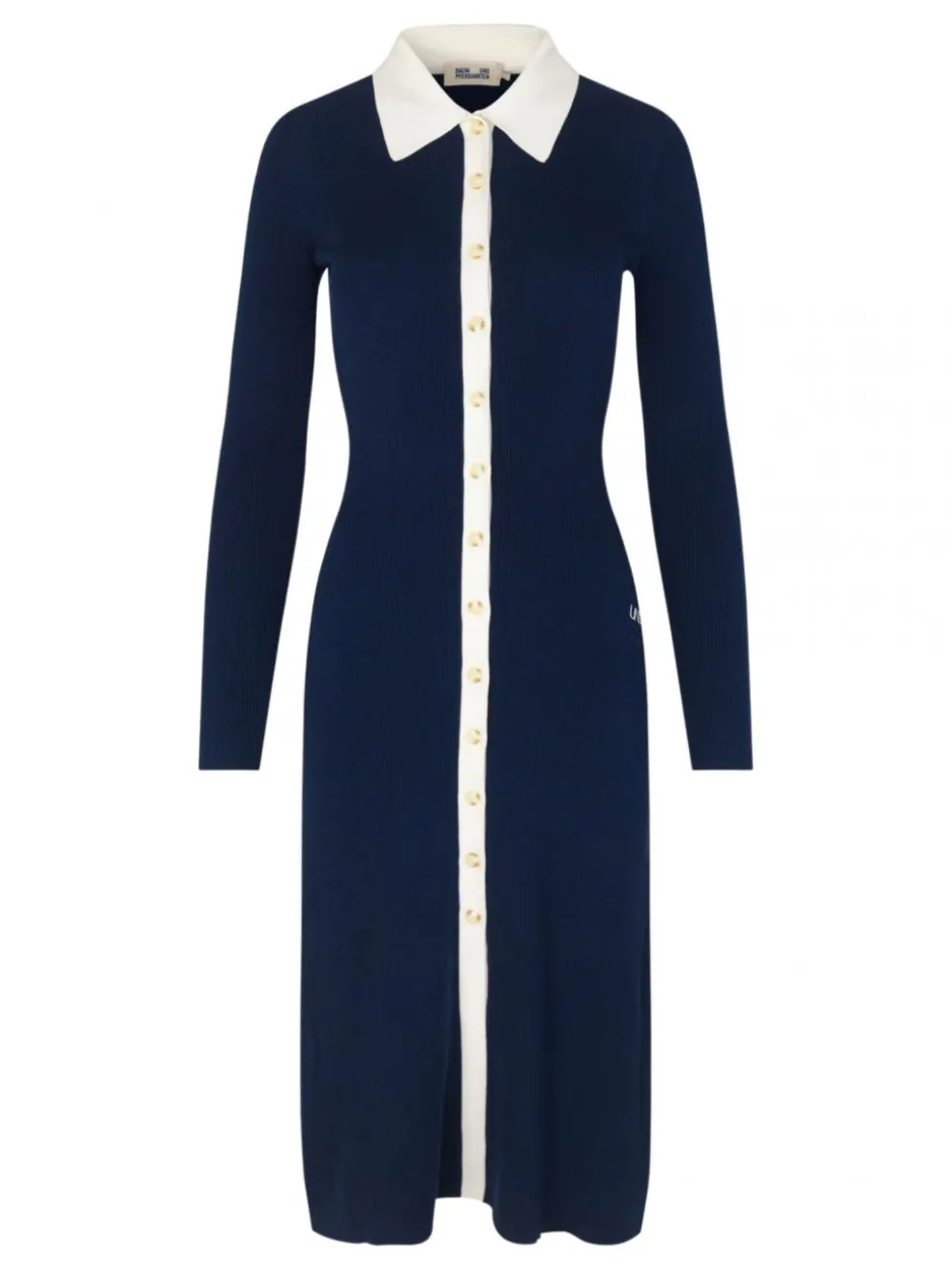 The ultimate between season piece the Casja Dress in Navy Blazer from Baum Und Pferdgarten is a ribbed knit cardigan style dress. Featuring long sleeves, contract collar and button placket. This midi length knit dress is form fitting and has a side hip embroidery details reading UND. Do double duty and wear this open like a long line cardigan over jeans and a tank top.