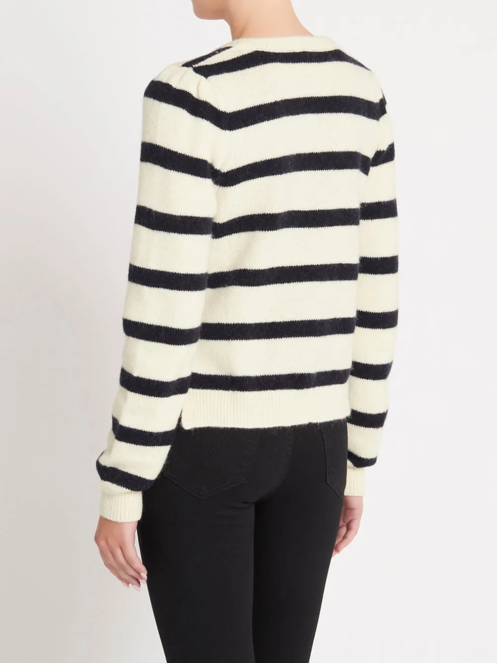 Embrace the waves in the nautical inspired Caprece Sweater by Baum Und Pferdgarten. This cozy V neck jumper is a cropped style with slits at the sides and a dipped hem. A gorgeous fully fashioned knit jumper, it features a double rib at the neck, wrists, and hem. Wear this style close to the body with your most loved high waisted jeans and a fresh sneaker.