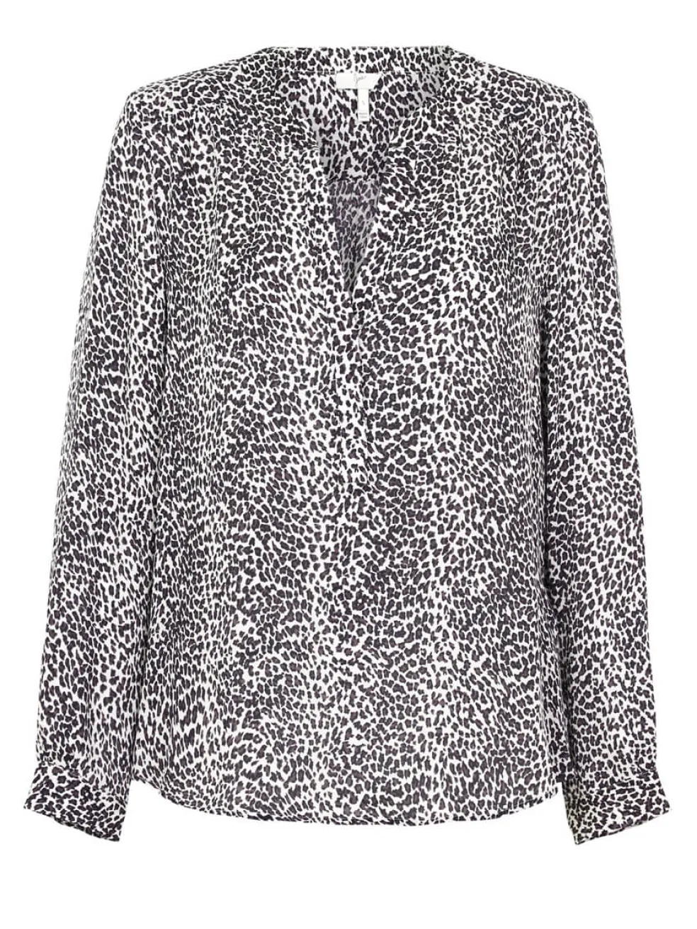 Indulge in the subtle allure of the Joie Carita blouse, where a delicate leopard print in shades of white and grey takes center stage. This elegant piece showcases a banded open split V neckline, adding a touch of sophistication to your ensemble. With long sleeves graced by button cuffs, this blouse seamlessly balances comfort and style.