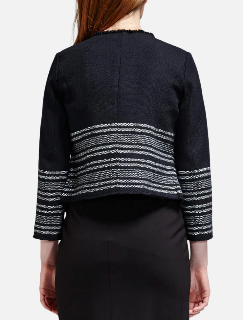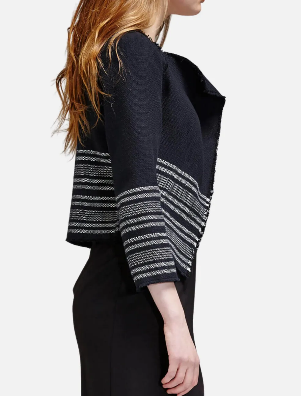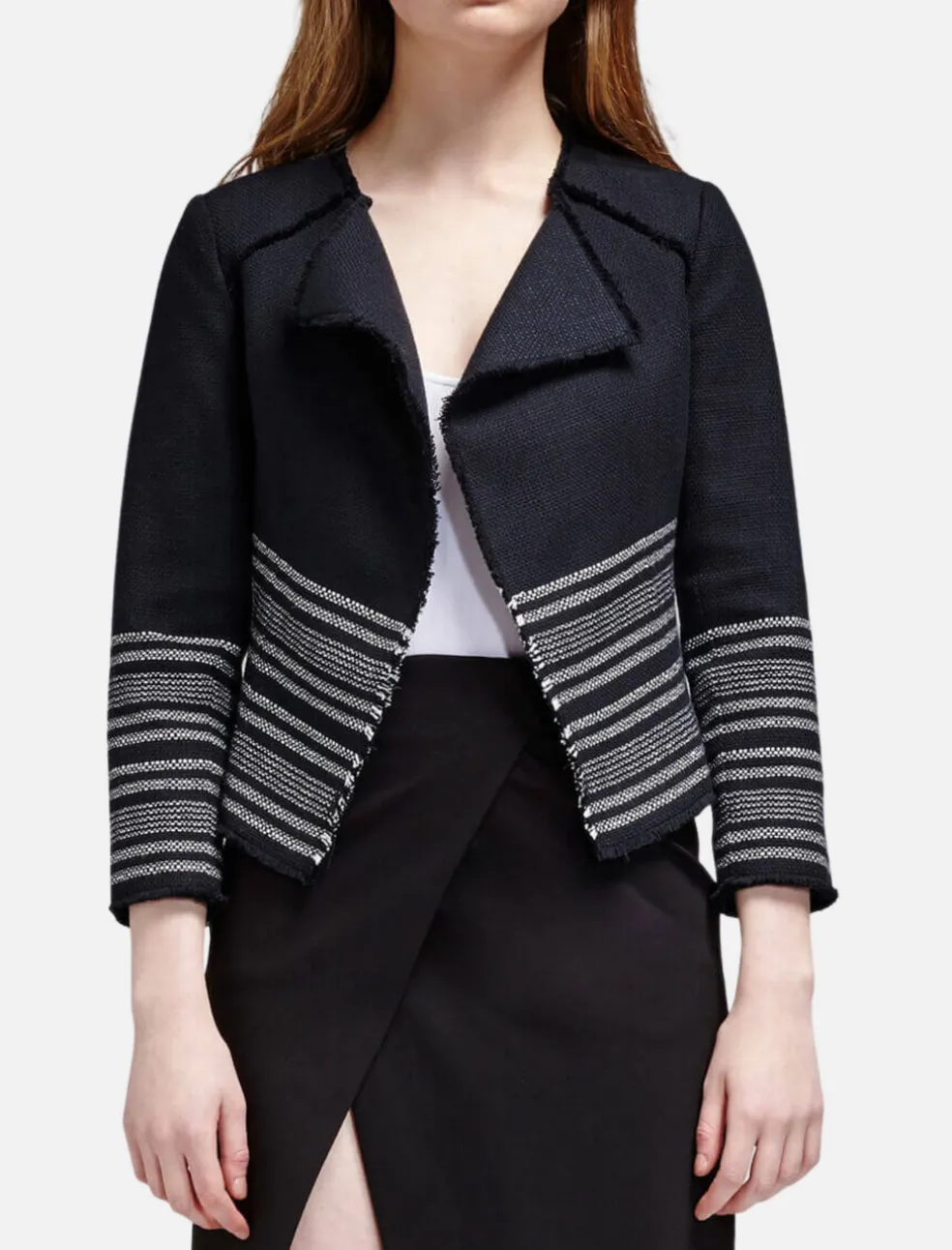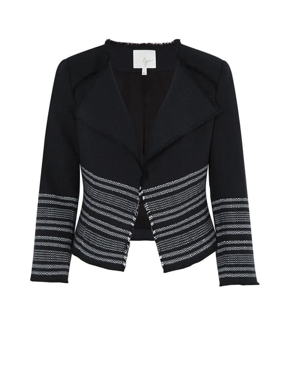 Streamlined and sophisticated, the Carver D Waterfall Jacket from Joie is a black and white tweed jacket with a boxy silhouette. This lined piece features wide notched lapels, shoulder pads and raw edged seam detail.
