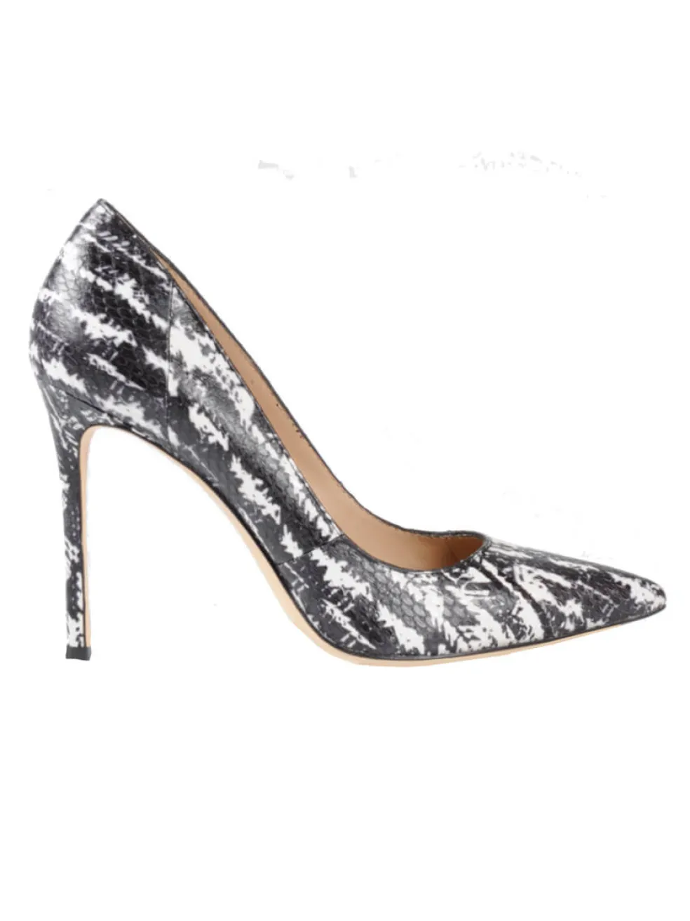 Take on some textured leather in the Celeste Heel. A classic pump silhouette by Pour La Victoire, they are a black and white painted snakeskin pattern, with a pointed toe and a slim stiletto heel.